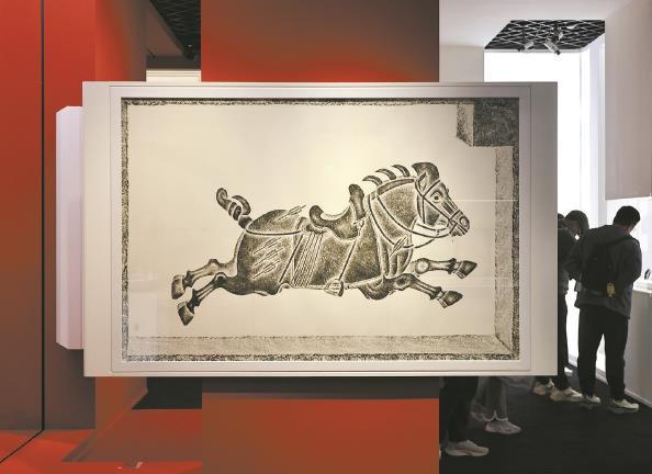 展厅整体红配黑,彰显新春喜色、龙马精神,展览荟萃16件组跨越千年的马主题文物,甄选来自甘肃省博物馆、甘肃省文物考古研究所、咸阳博物院及上博馆藏的主题文物。展览分为“鞍马征尘”“昭陵六骏”“骏影流光”“诗情画意”等板块,展现中华马文化的多元内涵与吉祥寓意。