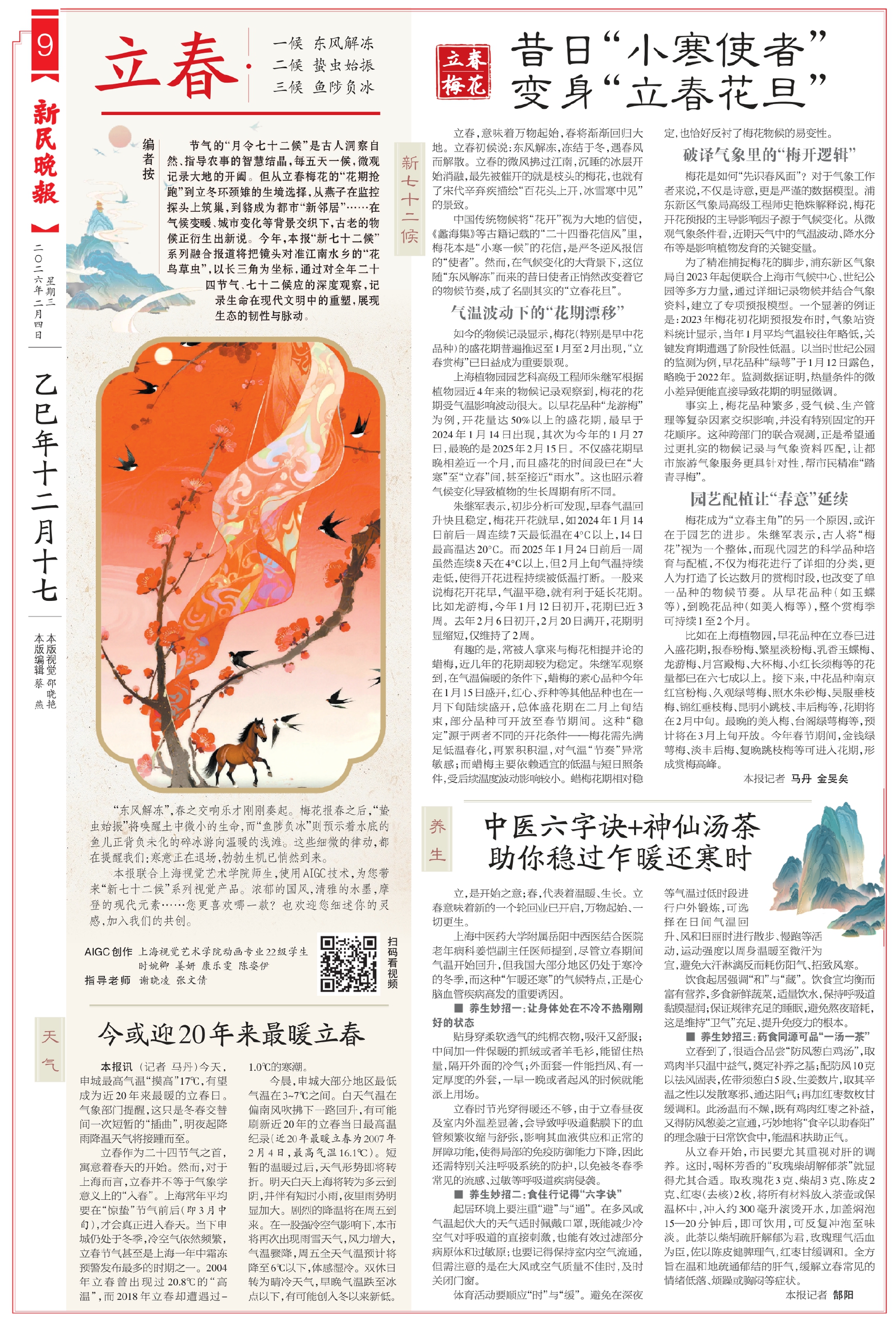 节气的“月令七十二候”是古人洞察自然、指导农事的智慧结晶,每五天一候,微观记录大地的开阖。但从立春梅花的“花期抢跑”到立冬环颈雉的生境选择,从燕子在监控探头上筑巢,到貉成为都市“新邻居”……在气候变暖、城市变化等背景交织下,古老的物候正衍生出新说。今年,本报“新七十二候”系列融合报道将把镜头对准江南水乡的“花鸟草虫”,以长三角为坐标,通过对全年二十四节气、七十二候应的深度观察,记录生命在现代文明中的重塑,展现生态的韧性与脉动。