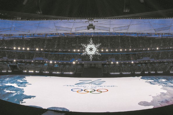 北京冬奥会闭幕式上展示了米兰冬奥会会徽 本报记者 李铭珅 摄