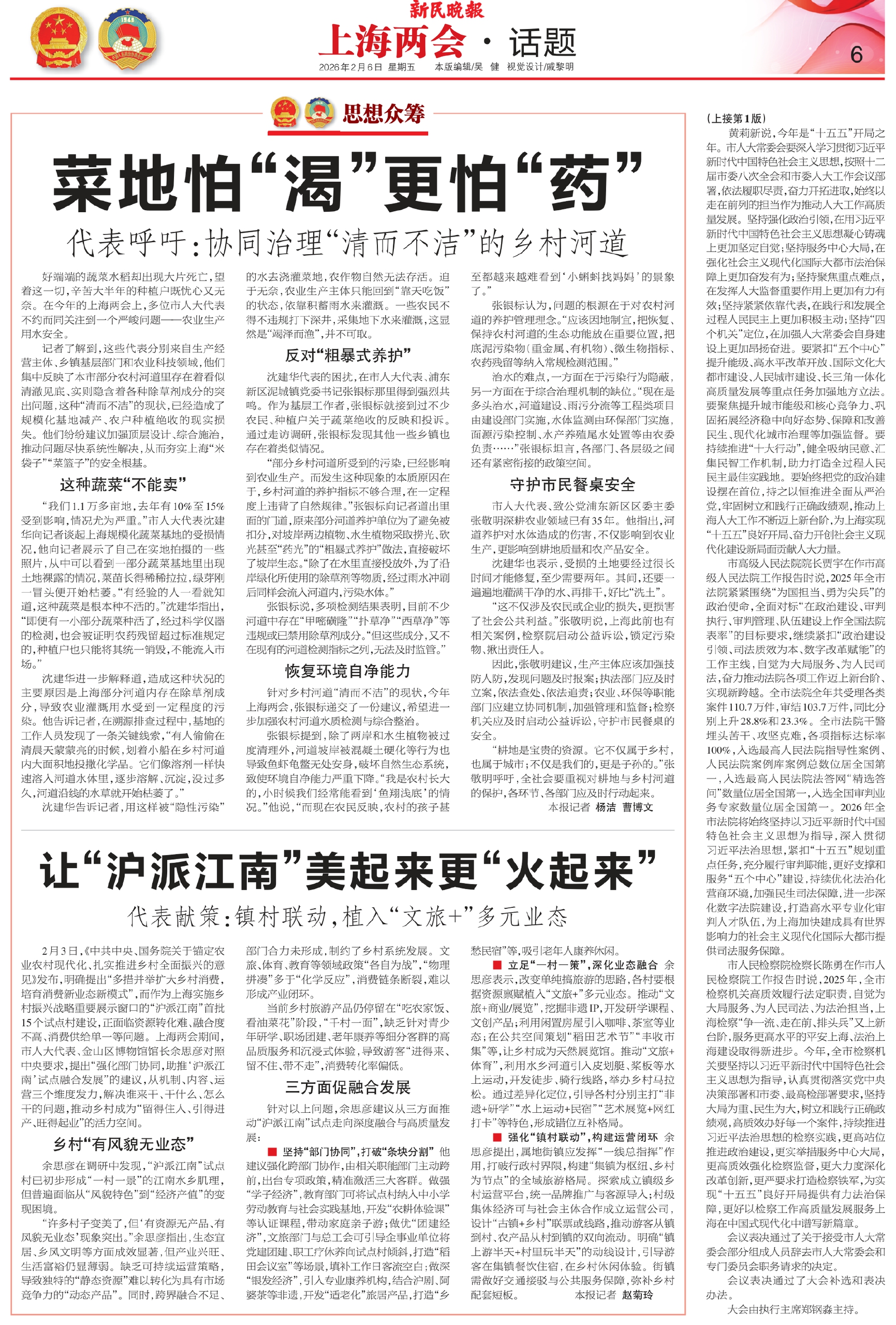 记者了解到,这些代表分别来自生产经营主体、乡镇基层部门和农业科技领域,他们集中反映了本市部分农村河道里存在着看似清澈见底、实则隐含着各种除草剂成分的突出问题,这种“清而不洁”的现状,已经造成了规模化基地减产、农户种植绝收的现实损失。他们纷纷建议加强顶层设计、综合施治,推动问题尽快系统性解决,从而夯实上海“米袋子”“菜篮子”的安全根基。