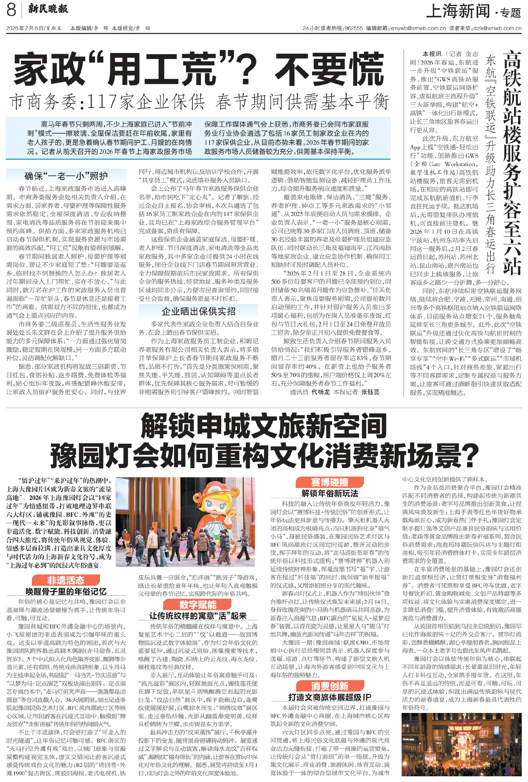 作为上海家政服务员工制企业,和姆尼养老服务有限公司相关负责人表示,将多措并举保障沪上长者春节期间家政服务不断档、品质不打折。“首先是分类施策保刚需,聚焦失能、半失能、独居、认知障碍等重点长者群体,优先保障其核心服务需求,对可暂缓的非刚需服务则引导客户错峰预约。同时智慧赋能提效率,依托数字化平台,优化服务派单逻辑:借助智能监测设备,减轻护理员工作压力,综合提升服务响应速度和质量。”