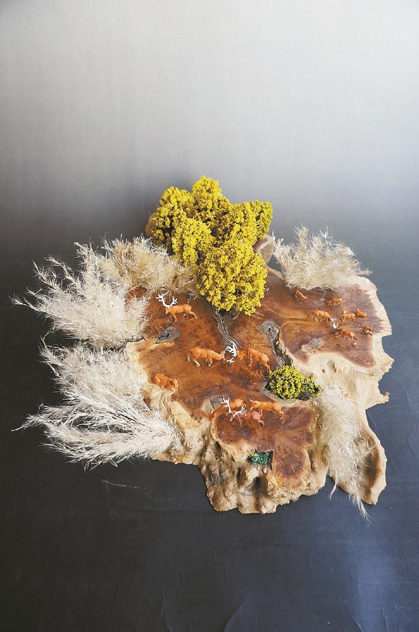 我以一块随形麻梨木为底板,其深色脉络如滩涂潮痕,隆起木结若草甸沙洲。又从花鸟市场觅得湿地绿植,拾来蝴蝶湾的芦花,再配上两款3D打印麋鹿模型,肌肉起伏、毛发层次皆栩栩如生,尽显湿地生命的蓬勃脉动。