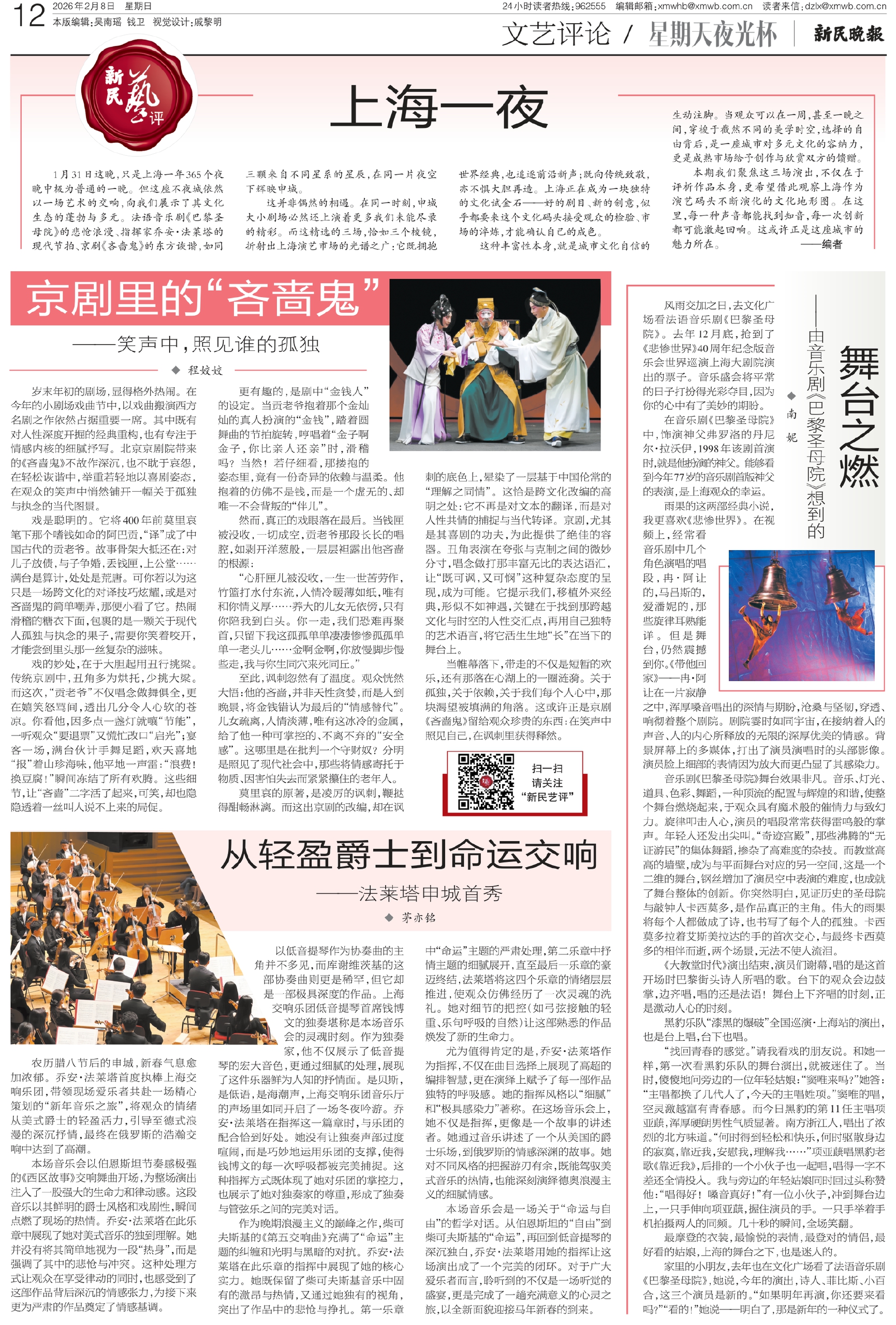 1月31日这晚,只是上海一年365个夜晚中极为普通的一晚。但这座不夜城依然以一场艺术的交响,向我们展示了其文化生态的蓬勃与多元。法语音乐剧《巴黎圣母院》的悲怆浪漫、指挥家乔安·法莱塔的现代节拍、京剧《吝啬鬼》的东方诙谐,如同三颗来自不同星系的星辰,在同一片夜空下辉映申城。
