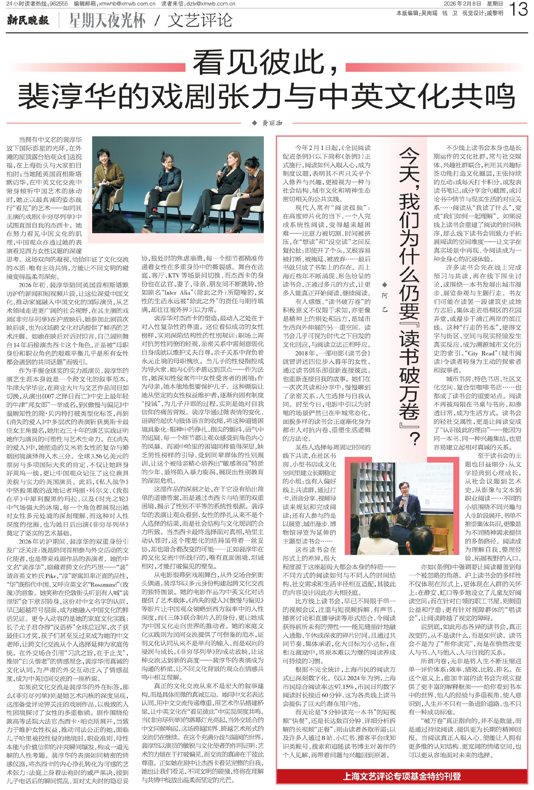 2026年初,裴淳华陪同英国首相斯塔默访沪的新闻和短视频片段,让这位深爱中国文化、推动家庭融入中国文化的国际演员,从艺术领域走进更广阔的社会视野,在其主演的戏剧《非穷尽列举》在沪放映后,她参加此剧首次映后谈,也为这场跨文化对话提供了鲜活的艺术注脚。如她在映后对话时坦言,自己阔别舞台14年后接演杰西卡这个角色,正是被“母职身份和职业角色的艰难平衡几乎是所有女性都会遇到的共同话题”而吸引。