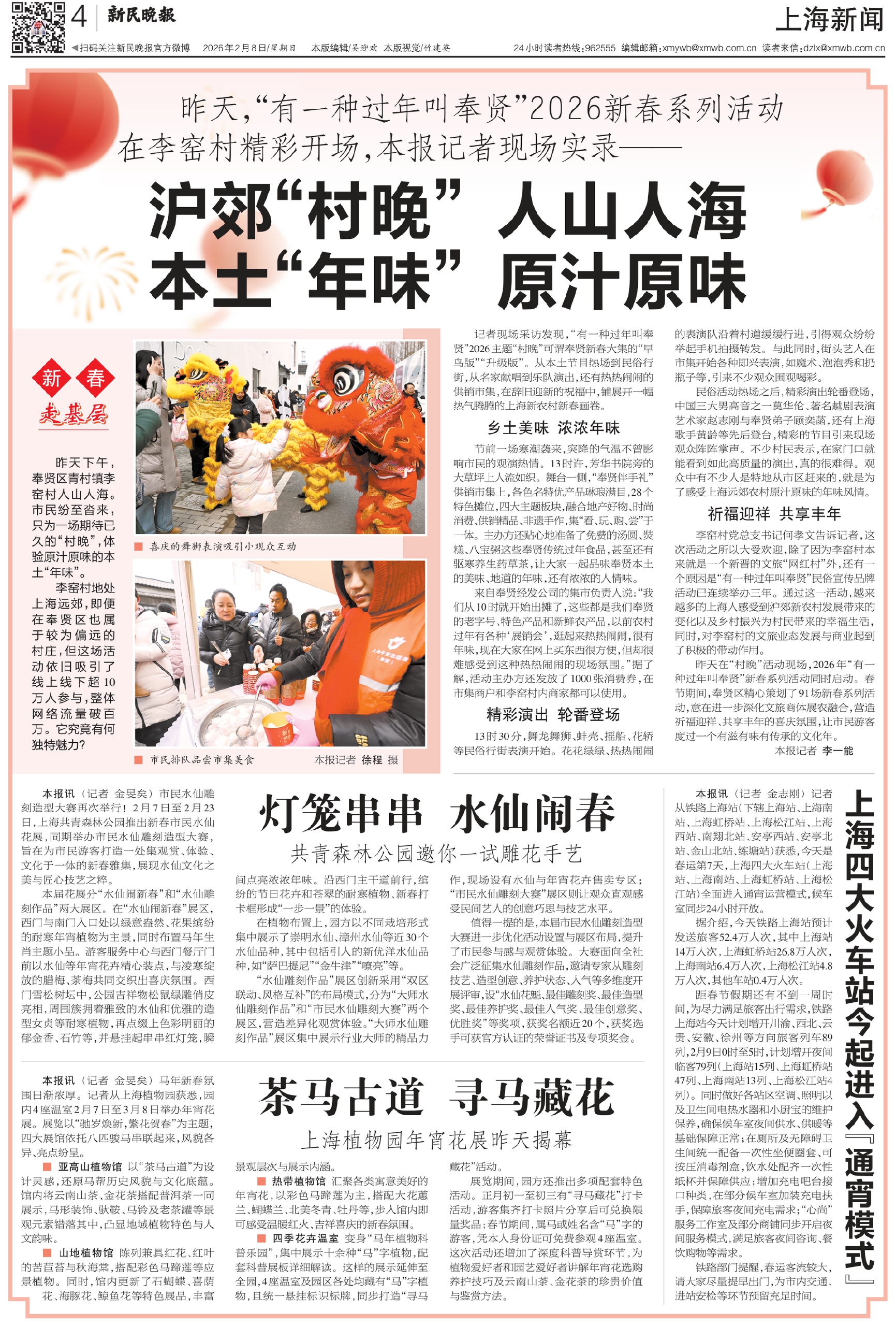 昨天在“村晚”活动现场,2026年“有一种过年叫奉贤”新春系列活动同时启动。春节期间,奉贤区精心策划了91场新春系列活动,意在进一步深化文旅商体展农融合,营造祈福迎祥、共享丰年的喜庆氛围,让市民游客度过一个有滋有味有传承的文化年。
