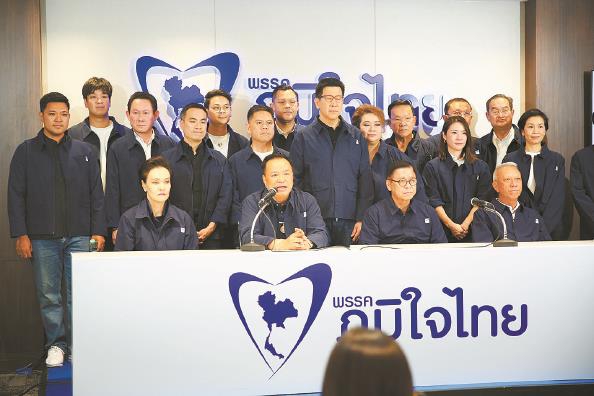 自豪泰党党首阿努廷(前排中)胜选后出席发布会 新华社 发