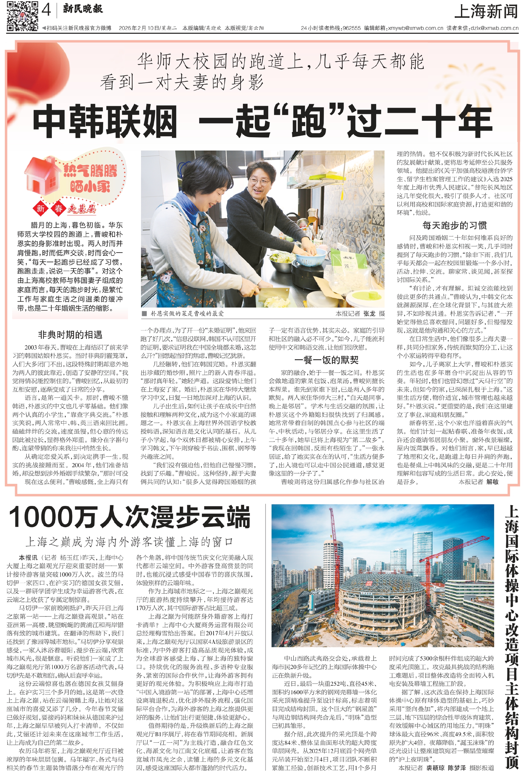 腊月的上海,暮色初临。华东师范大学校园的跑道上,曹峻和朴恩实的身影准时出现。两人时而并肩慢跑,时而低声交谈,时而会心一笑,“每天一起跑步已经成了习惯,跑跑走走,说说一天的事”。对这个由上海高校教师与韩国妻子组成的家庭而言,每天的跑步时光,是繁忙工作与家庭生活之间温柔的缓冲带,也是二十年婚姻生活的缩影。