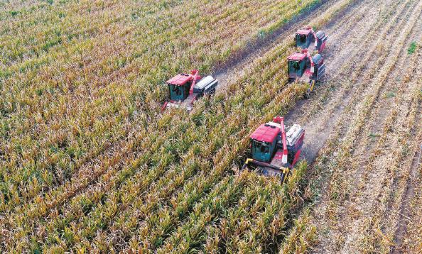 在安徽省亳州市谯城区赵桥乡无人农场,履带式收割机在进行玉米收获作业 IC 图