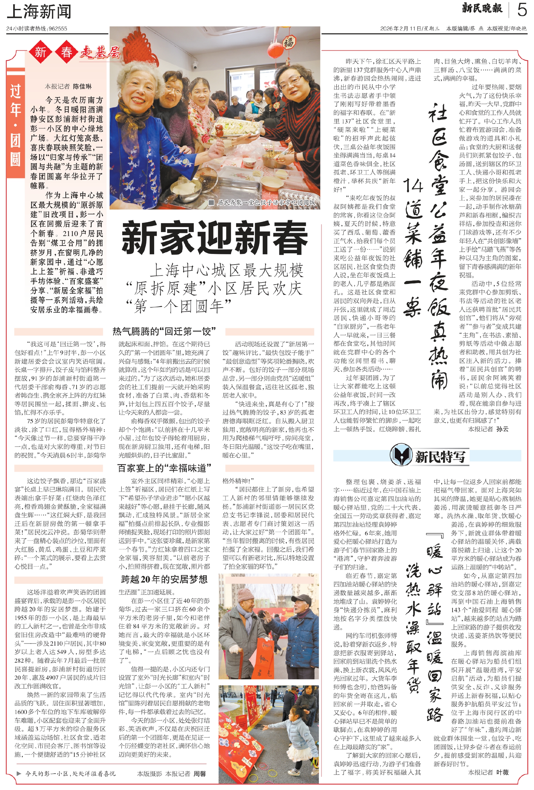 作为上海中心城区最大规模的“原拆原建”旧改项目,彭一小区在回搬后迎来了首个新春。2110户居民告别“煤卫合用”的拥挤岁月,在窗明几净的新家园中,通过“心愿上上签”祈福、非遗巧手坊体验、“百家盛宴”分享、“新居全家福”拍摄等一系列活动,共绘安居乐业的幸福画卷。