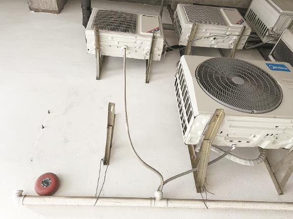 空调外机悬挂在消防通道内 本版摄影 徐驰