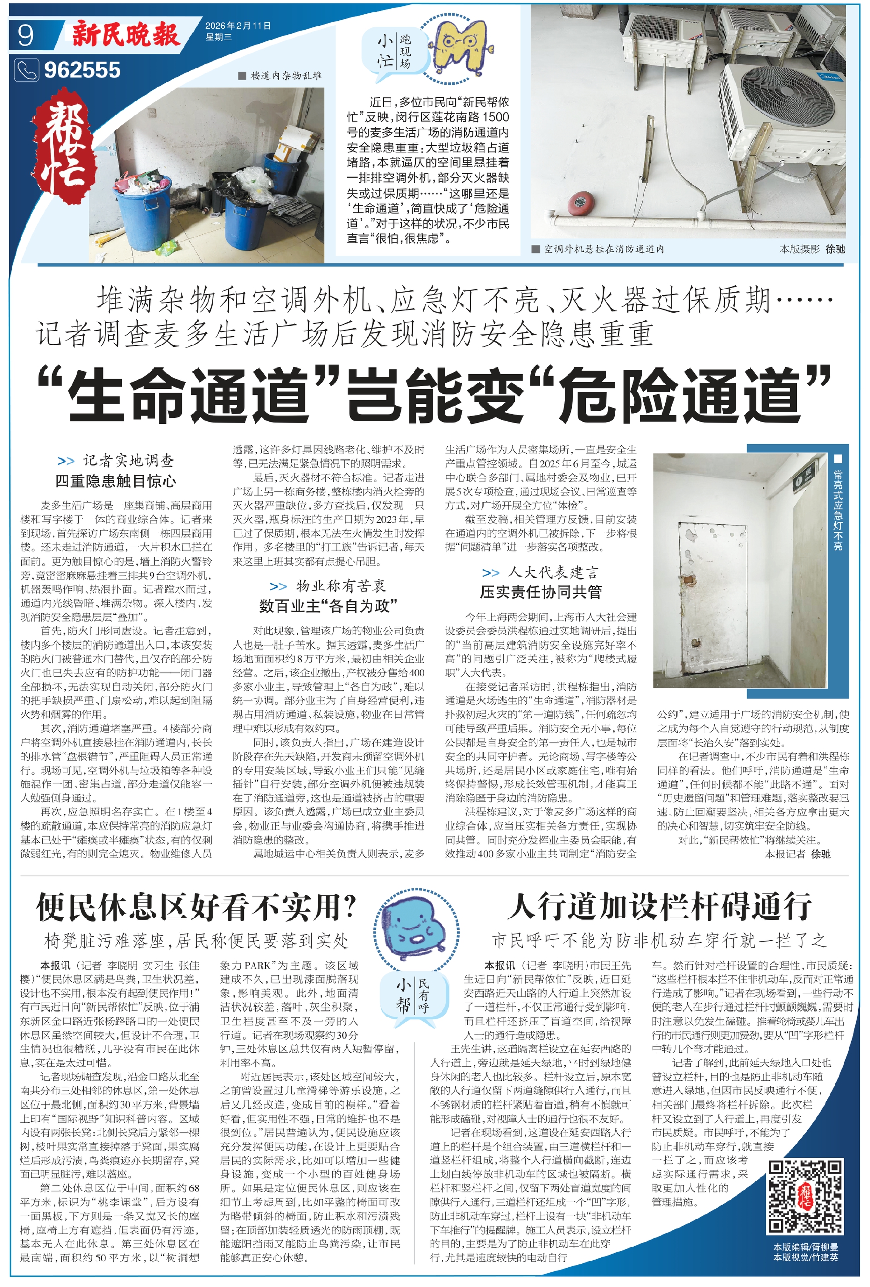 近日,多位市民向“新民帮侬忙”反映,闵行区莲花南路1500号的麦多生活广场的消防通道内安全隐患重重:大型垃圾箱占道堵路,本就逼仄的空间里悬挂着一排排空调外机,部分灭火器缺失或过保质期……“这哪里还是‘生命通道’,简直快成了‘危险通道’。”对于这样的状况,不少市民直言“很怕,很焦虑”。
