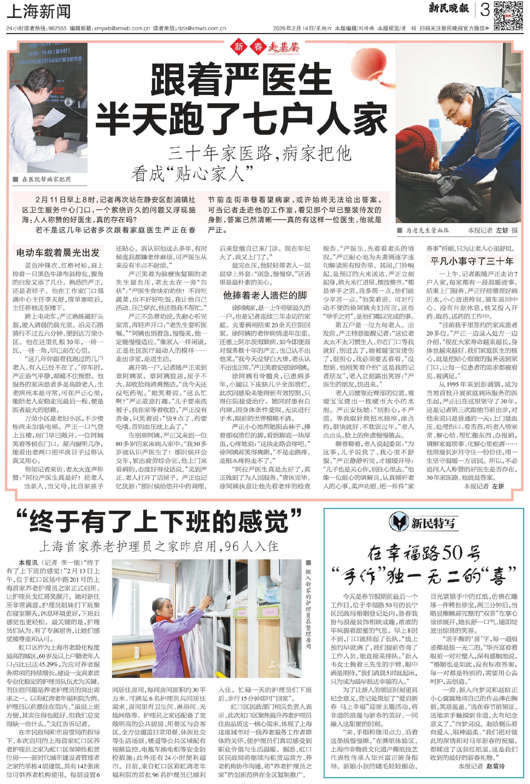 从1995年来到彭浦镇,成为当地首批开展家庭病床服务的医生起,严正已在这里坚守了30年。这是记者第三次跟他节前出诊,对他来说只是普通的一天:上门量血压、处理伤口、看舌苔,听老人唠家常、解心结,帮忙搬东西、办报销,调解家庭琐事、化解心里疙瘩……他用漫长岁月守住一份信任,用一生坚守温暖一方居民。所以,不必追问人人称赞的好医生是否存在,30年家医路,他就是答案。