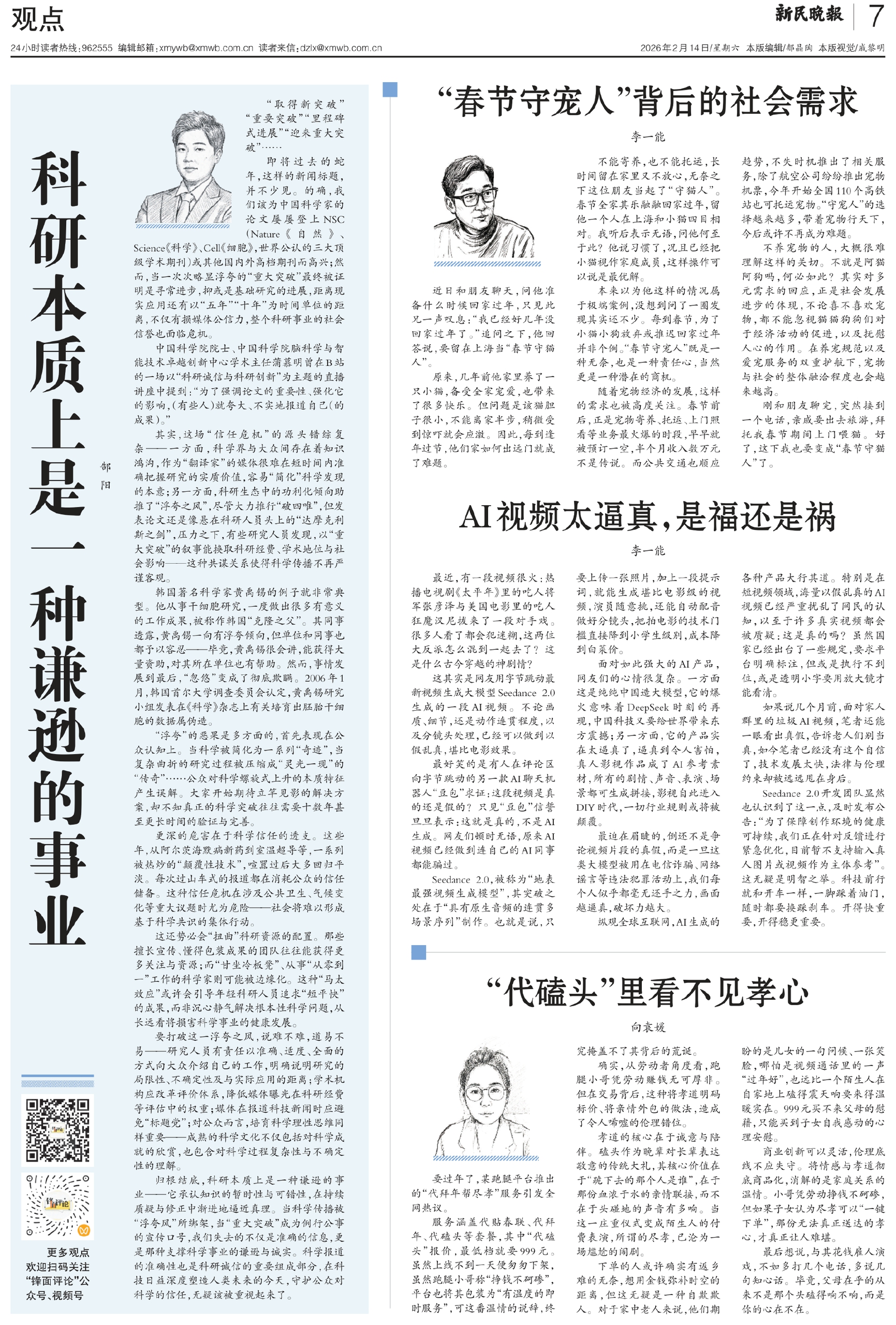 “代磕头”里看不见孝心 “春节守宠人”背后的社会需求 AI视频太逼真,是福还是祸 科研本质上是一种谦逊的事业