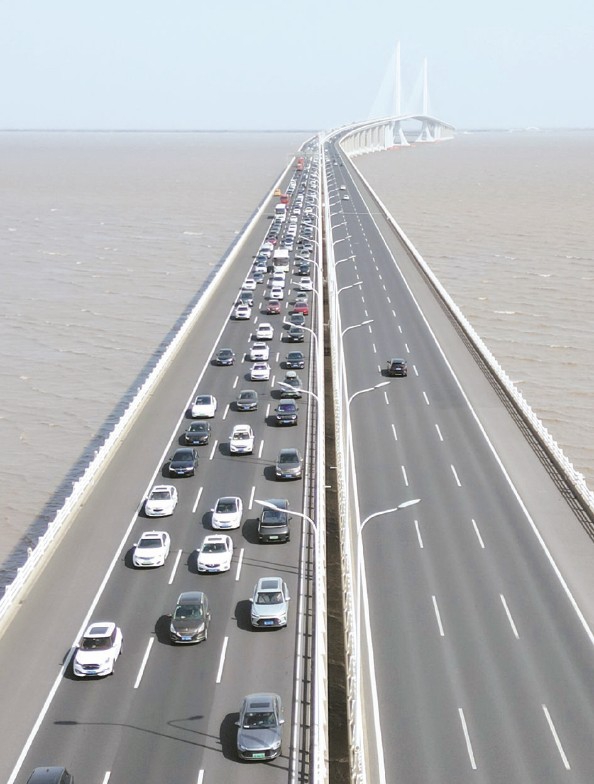 上午11时,G40沪陕高速上海长江大桥段往市区方向车流量大 本报记者 张龙 摄