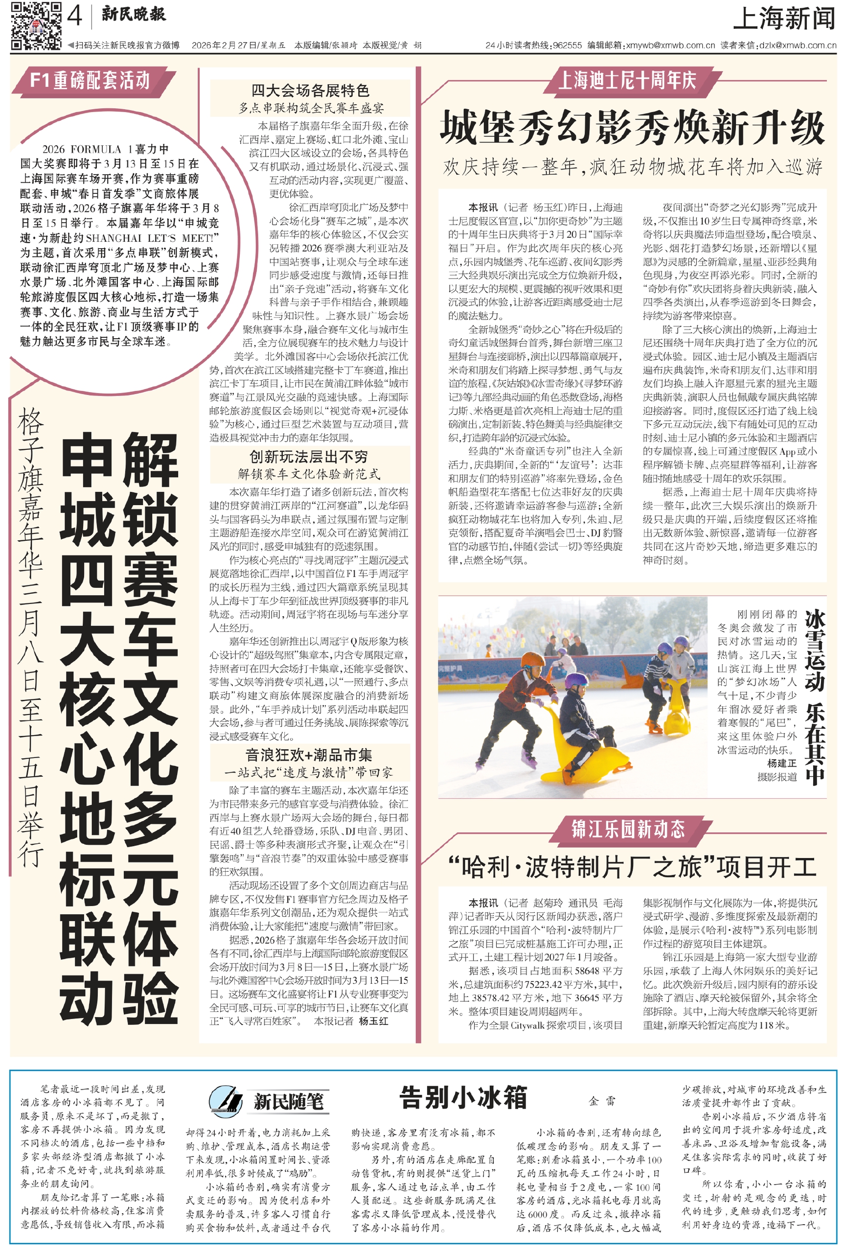 据悉,2026格子旗嘉年华各会场开放时间各有不同,徐汇西岸与上海国际邮轮旅游度假区会场开放时间为3月8日—15日,上赛水景广场与北外滩国客中心会场开放时间为3月13日—15日。这场赛车文化盛宴将让F1从专业赛事变为全民可感、可玩、可享的城市节日,让赛车文化真正“飞入寻常百姓家”。 本报记者 杨玉红
