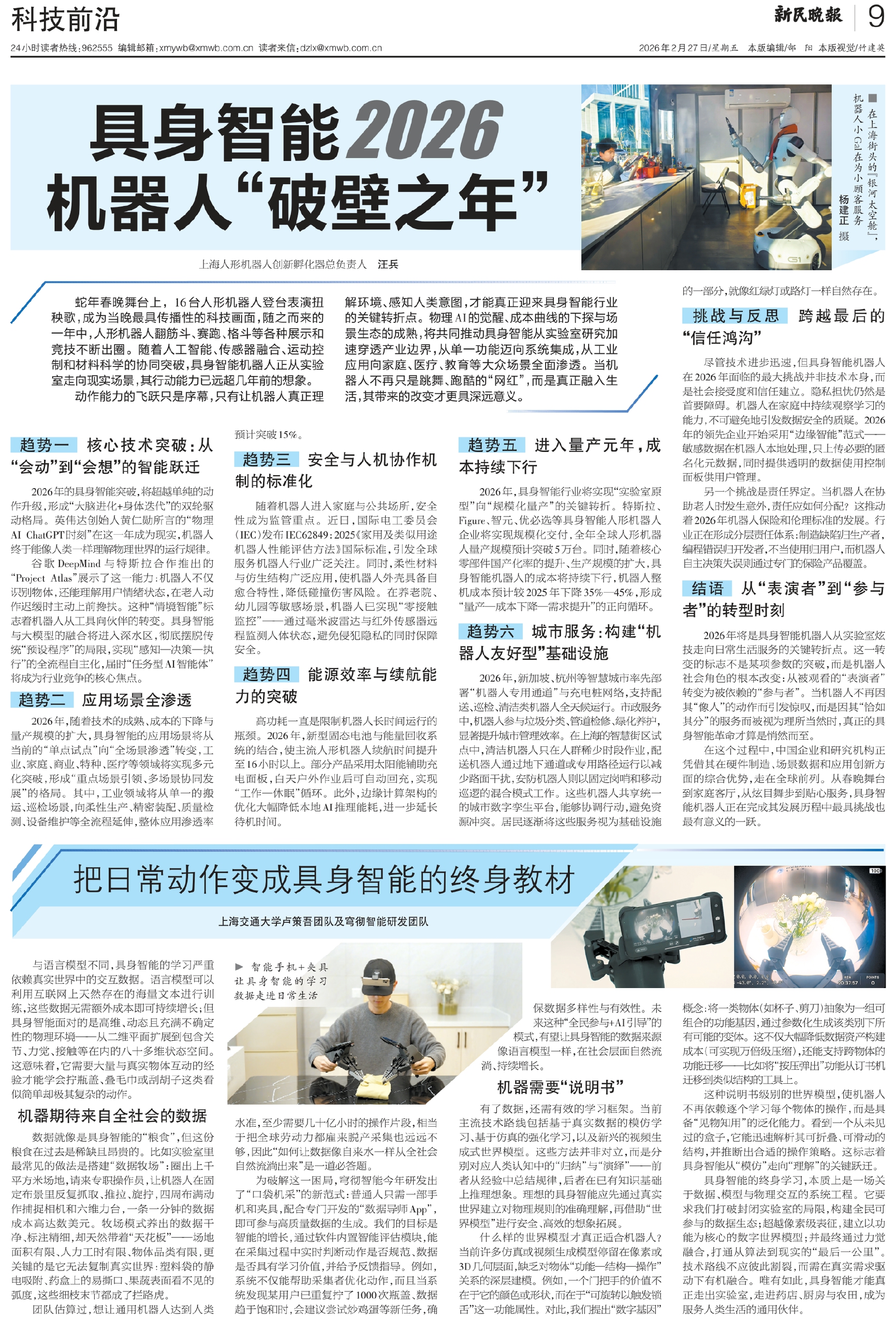 2026年将是具身智能机器人从实验室炫技走向日常生活服务的关键转折点。这一转变的标志不是某项参数的突破,而是机器人社会角色的根本改变:从被观看的“表演者”转变为被依赖的“参与者”。当机器人不再因其“像人”的动作而引发惊叹,而是因其“恰如其分”的服务而被视为理所当然时,真正的具身智能革命才算是悄然而至。