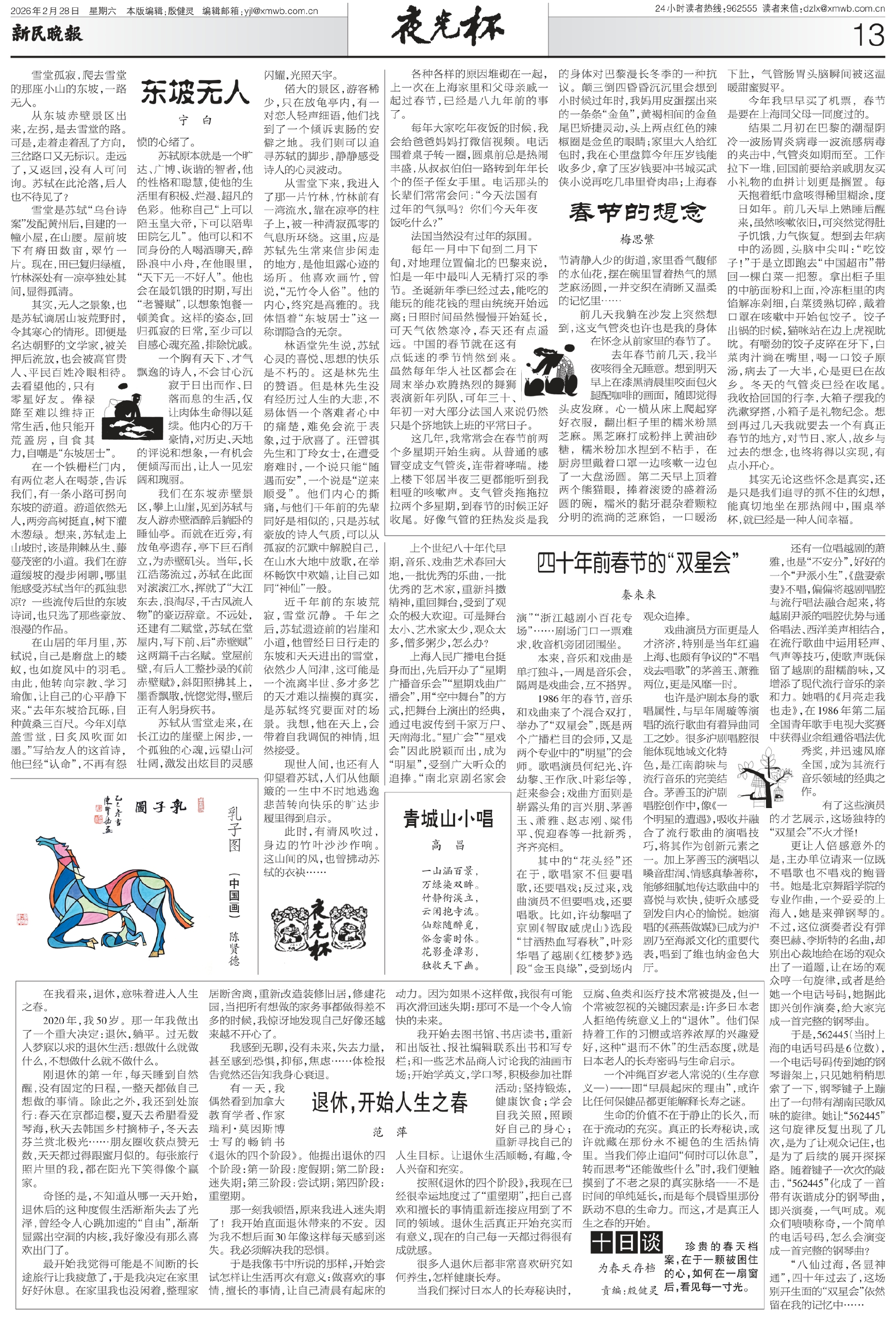 林语堂先生说,苏轼心灵的喜悦、思想的快乐是不朽的。这是林先生的赞语。但是林先生没有经历过人生的大悲,不易体悟一个落难者心中的痛楚,难免会流于表象,过于欣喜了。汪曾祺先生和丁玲女士,在遭受磨难时,一个说只能“随遇而安”,一个说是“逆来顺受”。他们内心的撕痛,与他们千年前的先辈同好是相似的,只是苏轼豪放的诗人气质,可以从孤寂的沉默中解脱自己,在山水大地中放歌,在举杯畅饮中欢嬉,让自己如同“神仙”一般。