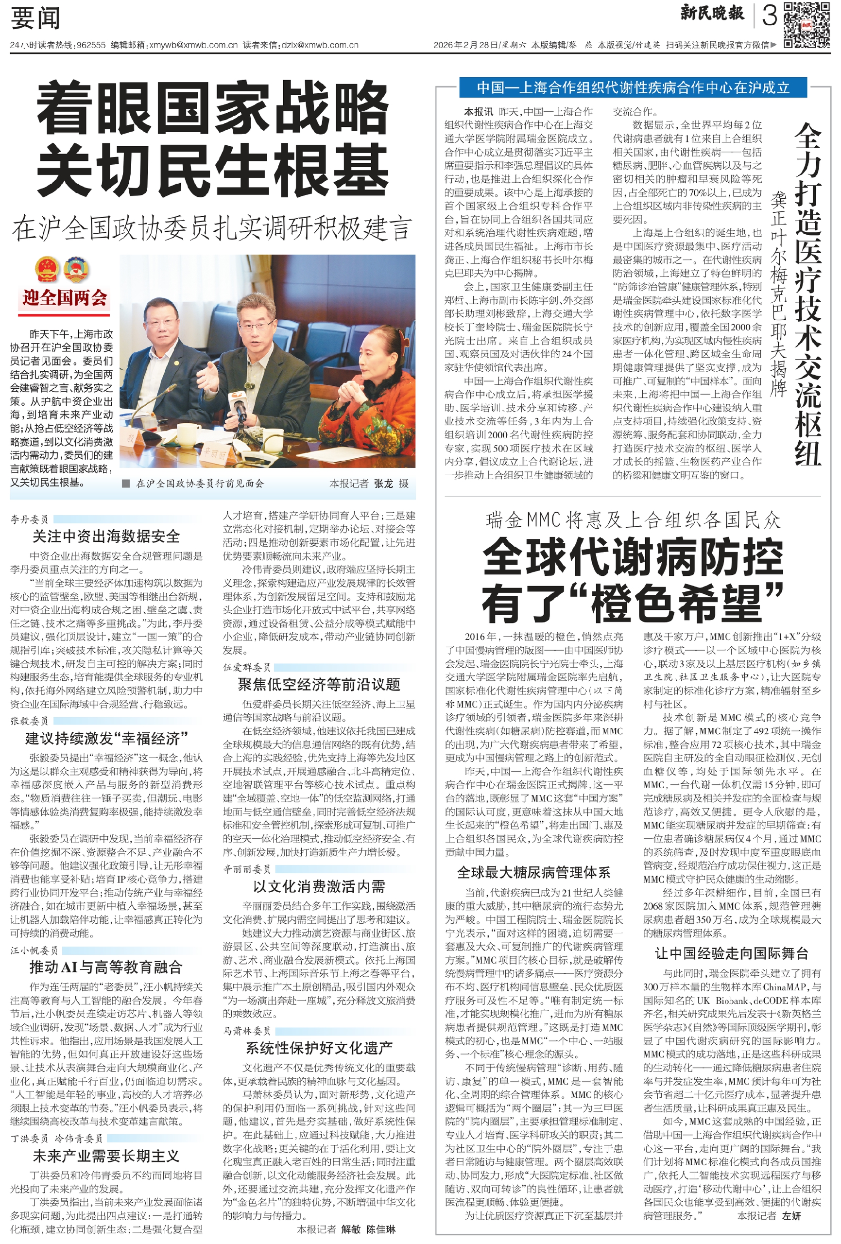 昨天下午,上海市政协召开在沪全国政协委员记者见面会。委员们结合扎实调研,为全国两会建睿智之言、献务实之策。从护航中资企业出海,到培育未来产业动能;从抢占低空经济等战略赛道,到以文化消费激活内需动力,委员们的建言献策既着眼国家战略,又关切民生根基。