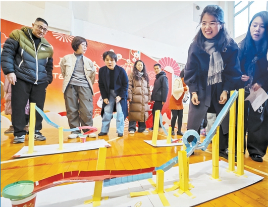 大屏幕上的倒计时不断跳跃,小组成员们或趴或站,围绕着一组由管道、转盘等组成的纸质材料忙碌着。他们的任务是要在规定时间内设计制作出一座至少包含3种轨道结构的纸质过山车模型。设计的关卡越多,弹珠滚落的时间越长,得分越高。“这里要高一点,对,再高一点试试!”“你来,你贴得比我好,对,就这样,调整一下角度,完美!”讨论声、欢呼声、呼朋唤友寻求帮助声,不绝于耳。