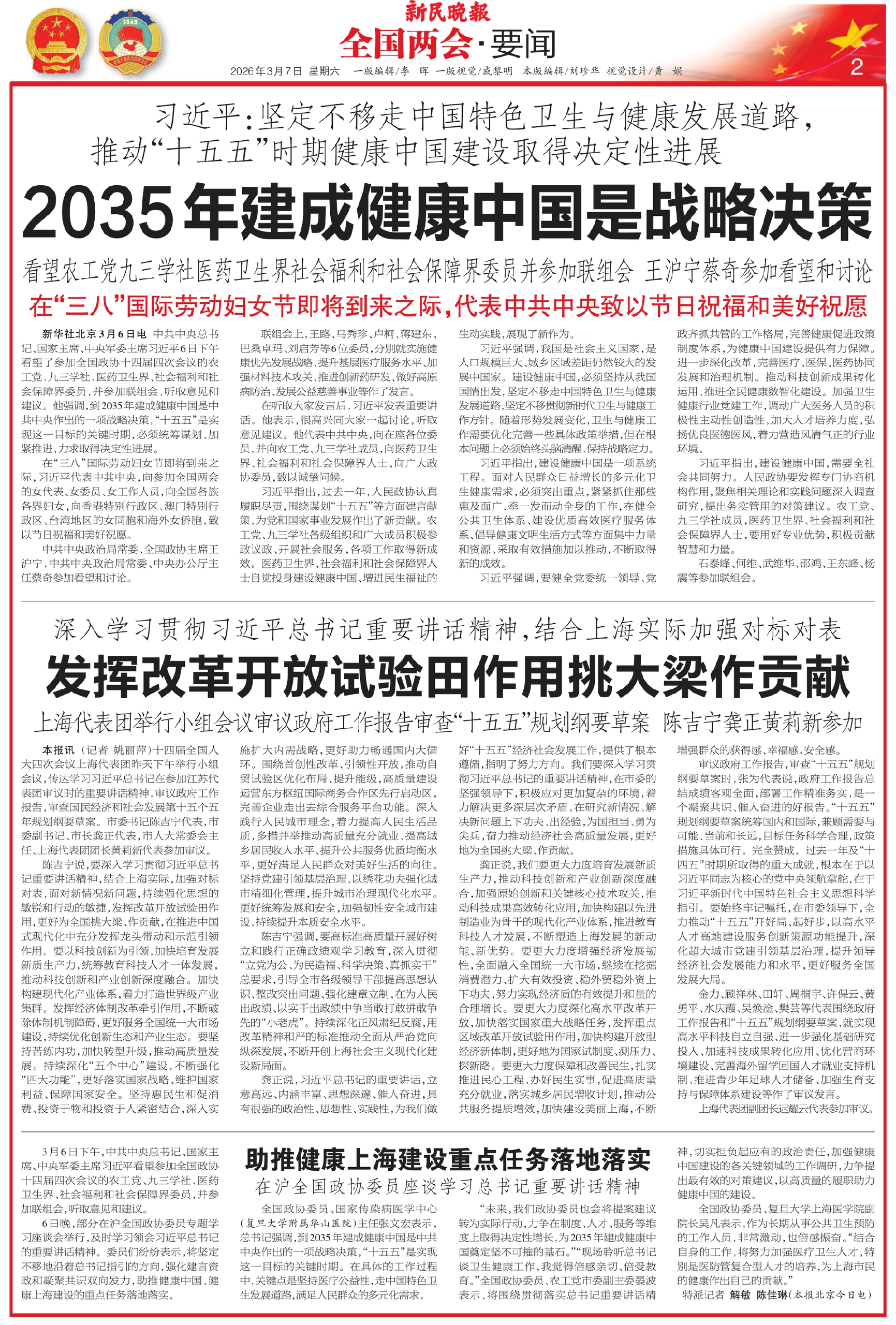新华社北京3月6日电 中共中央总书记、国家主席、中央军委主席习近平6日下午看望了参加全国政协十四届四次会议的农工党、九三学社、医药卫生界、社会福利和社会保障界委员,并参加联组会,听取意见和建议。他强调,到2035年建成健康中国是中共中央作出的一项战略决策,“十五五”是实现这一目标的关键时期,必须统筹谋划、加紧推进,力求取得决定性进展。