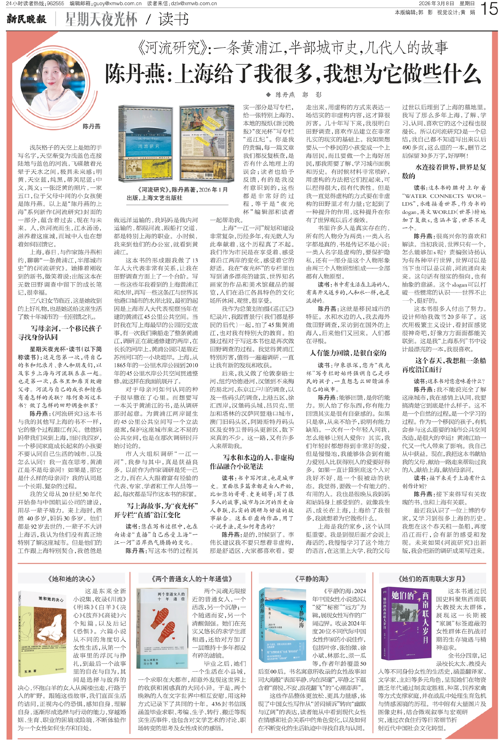 上海,春日,与作家陈丹燕相约,聊聊“一条黄浦江,半部城市史”的《河流研究》。她捧着刚收到的新书,微笑着说:出版这本在无数田野调查中留下的成长笔记,很幸福。