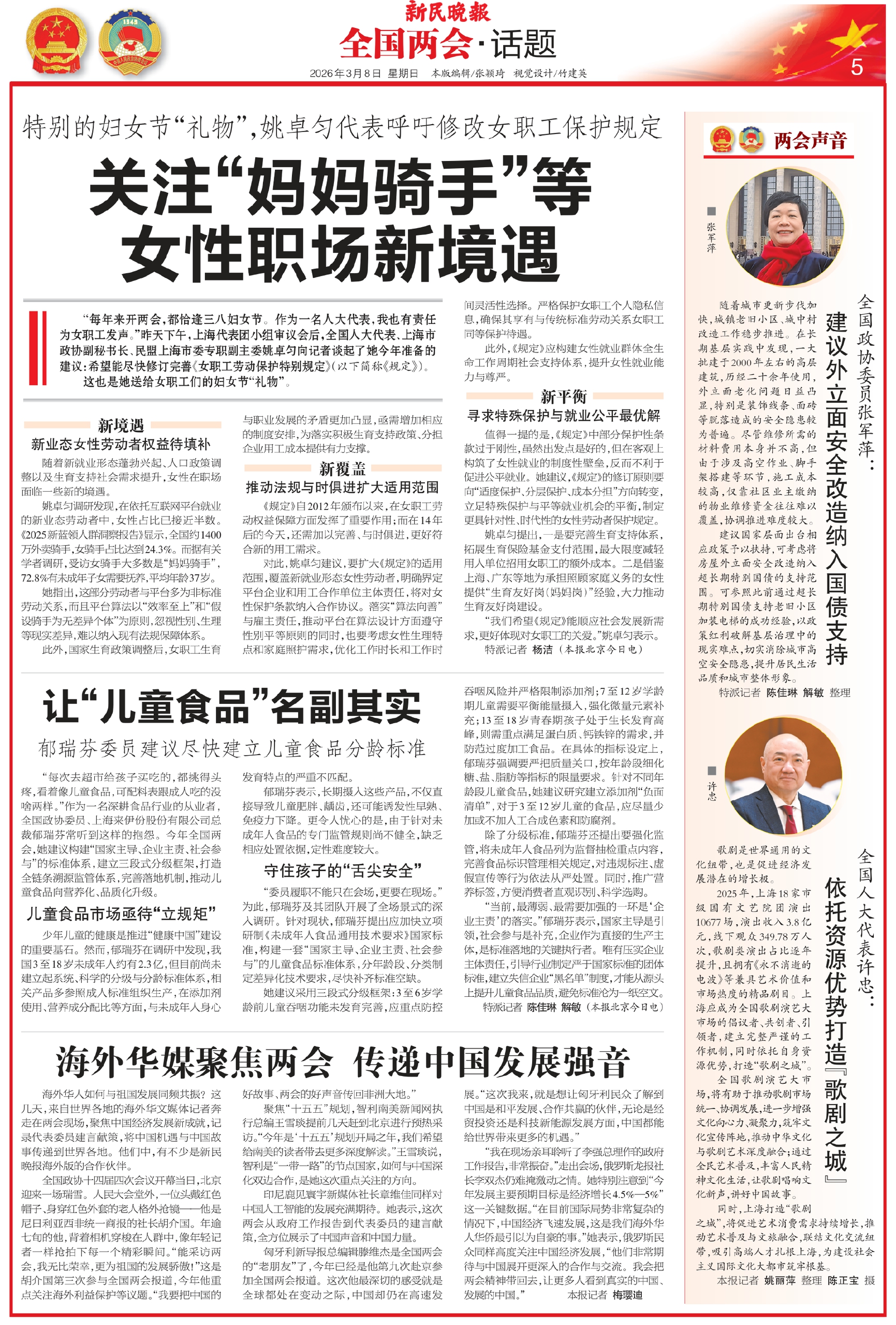 “每年来开两会,都恰逢三八妇女节。作为一名人大代表,我也有责任为女职工发声。”昨天下午,上海代表团小组审议会后,全国人大代表、上海市政协副秘书长、民盟上海市委专职副主委姚卓匀向记者谈起了她今年准备的建议:希望能尽快修订完善《女职工劳动保护特别规定》(以下简称《规定》)。