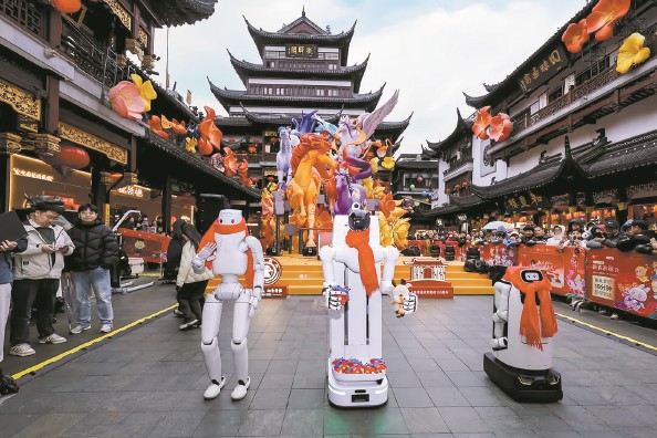 元宵节的豫园,九曲桥畔的光影深处,由上海交通大学、上海人工智能研究院孵化的具身智能创业企业精心打造了未来感十足的智能互动区,多款智能机器人在此各显神通。一台人形机器人站在人群中,微微侧身,向经过的孩童挥手——它的动作节奏被刻意调慢半拍,不急切、不机械,像一个真正站在灯会里看热闹的人。另一台守在灯会入口的语音交互机器人,则根据游客的反应实时生成讲解内容:人们多看哪件展品一眼,它就多讲几句;有游客皱起眉头、面露不解,它就停下来耐心询问:“需要再讲一遍吗?”