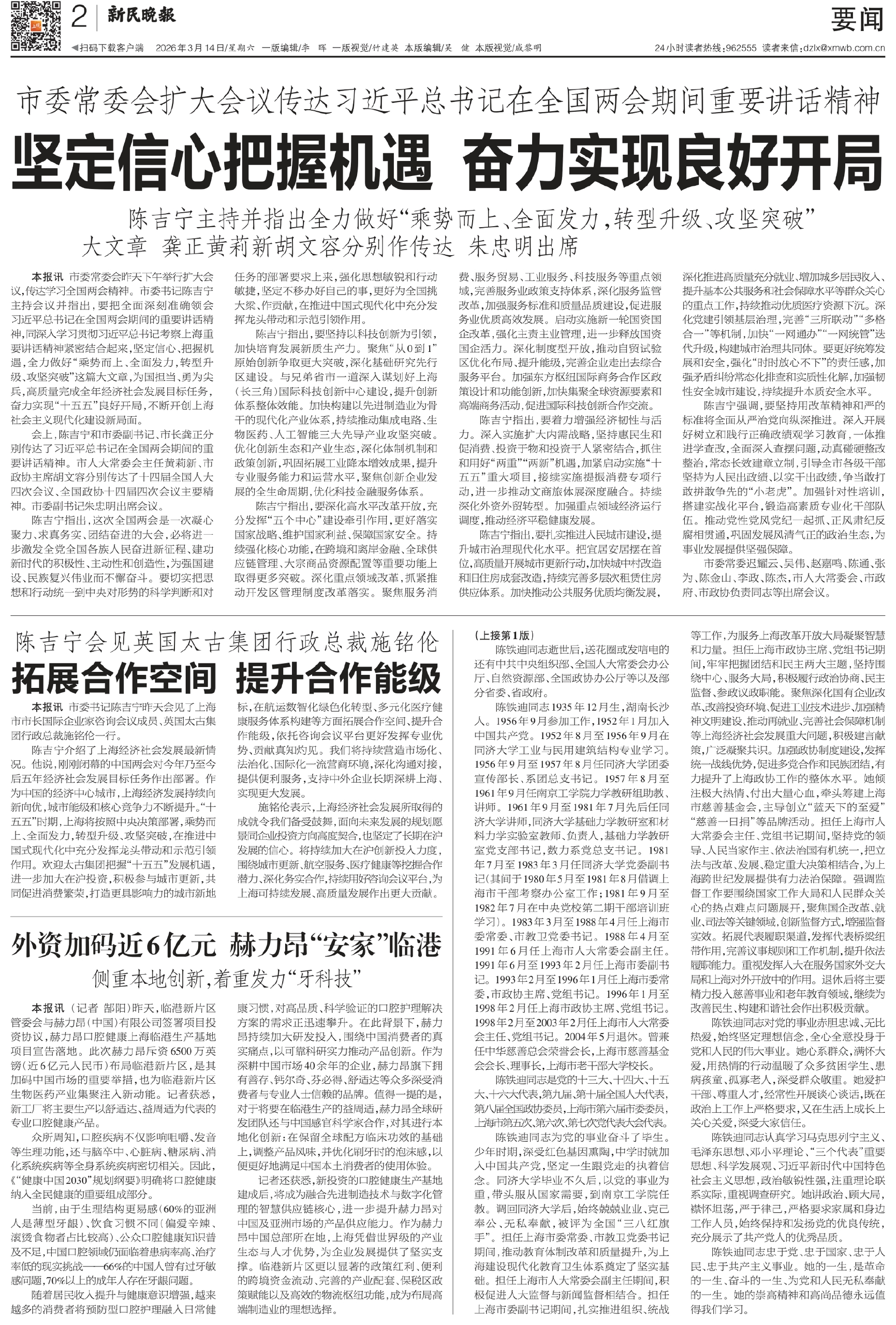 本报讯 市委常委会昨天下午举行扩大会议,传达学习全国两会精神。市委书记陈吉宁主持会议并指出,要把全面深刻准确领会习近平总书记在全国两会期间的重要讲话精神,同深入学习贯彻习近平总书记考察上海重要讲话精神紧密结合起来,坚定信心、把握机遇,全力做好“乘势而上、全面发力,转型升级、攻坚突破”这篇大文章,为国担当、勇为尖兵,高质量完成全年经济社会发展目标任务,奋力实现“十五五”良好开局,不断开创上海社会主义现代化建设新局面。