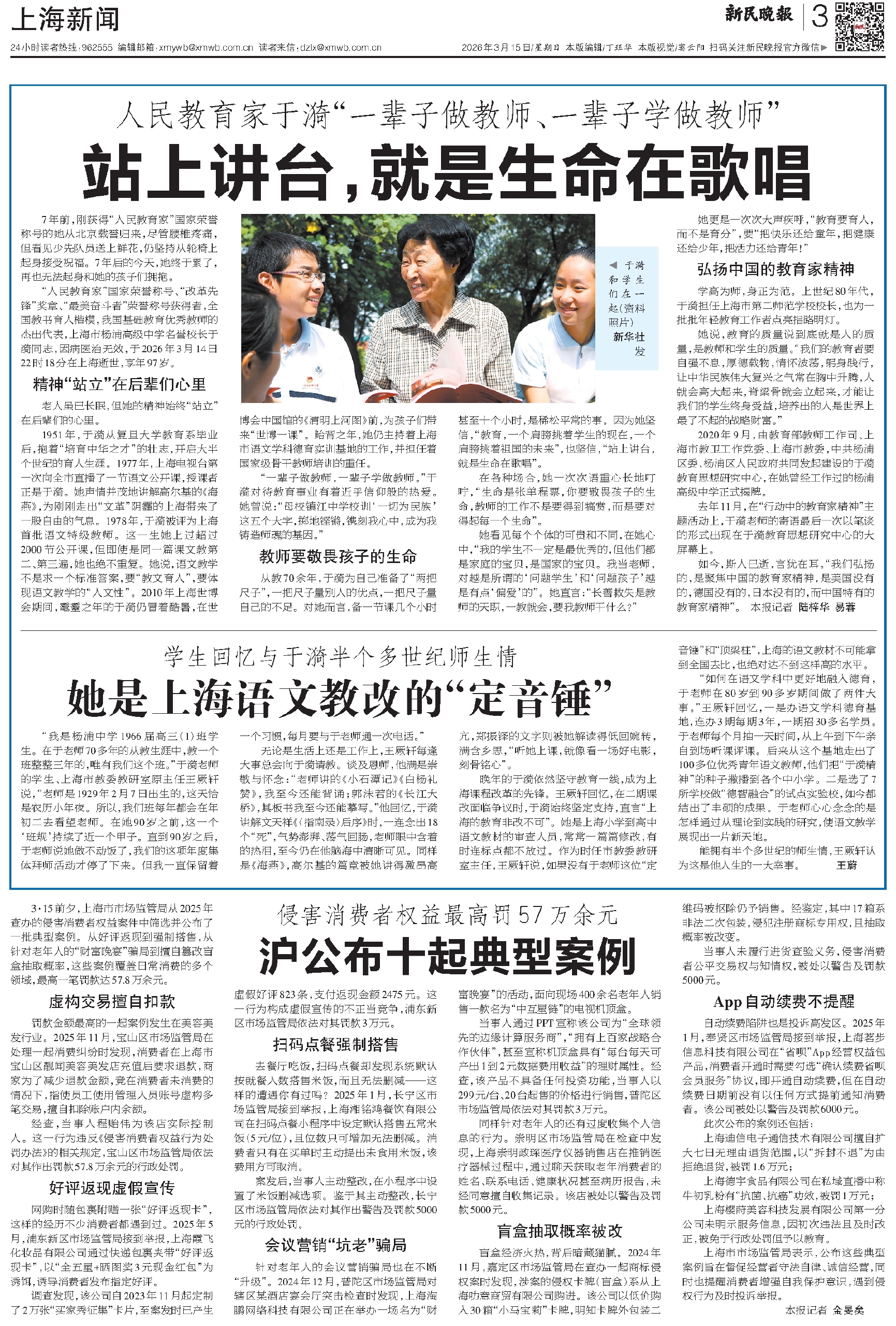 “人民教育家”国家荣誉称号、“改革先锋”奖章、“最美奋斗者”荣誉称号获得者,全国教书育人楷模,我国基础教育优秀教师的杰出代表,上海市杨浦高级中学名誉校长于漪同志,因病医治无效,于2026年3月14日22时18分在上海逝世,享年97岁。