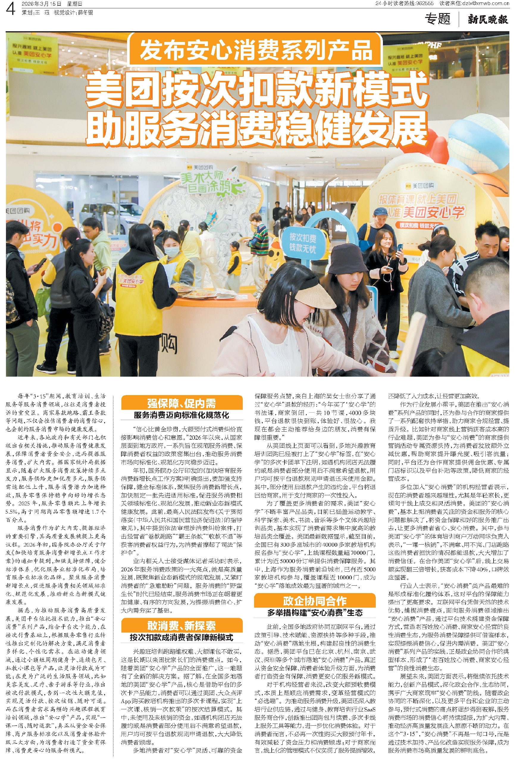 行业人士表示,“安心消费”类产品最难的是形成标准化履约体系,这对平台的保障能力提出了更高要求。互联网平台凭借天然的技术优势,捕捉消费痛点,面向服务消费领域推出“安心消费”产品,通过平台技术搭建资金保障方式,营造老百姓放心消费、商家安心经营的良性消费生态,为服务消费保障提供可借鉴样本,实现提振消费信心,促进内需消费。美团“安心消费”系列产品的实践,正是政企协同合作的典型样本,形成了“老百姓放心消费、商家安心经营”的良性消费生态。