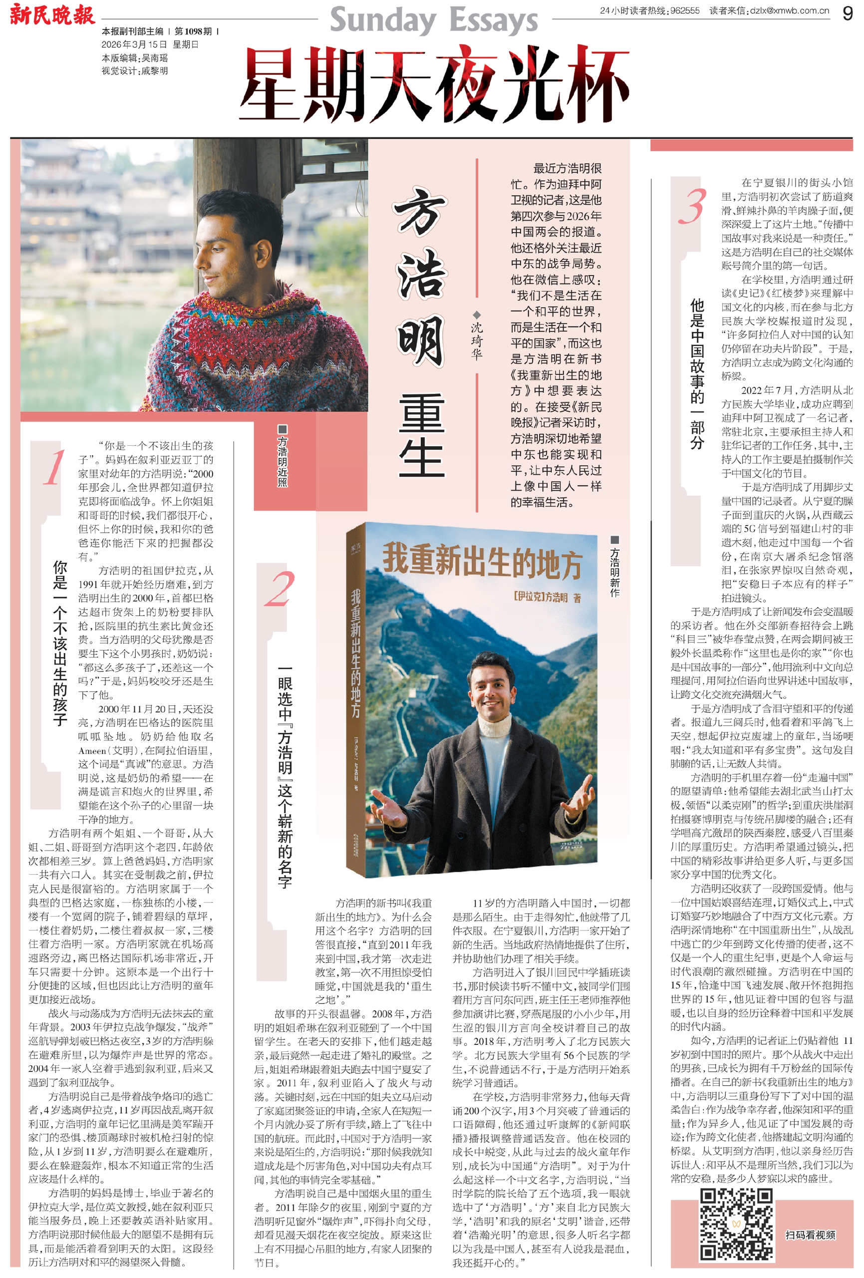 最近方浩明很忙。作为迪拜中阿卫视的记者,这是他第四次参与2026年中国两会的报道。他还格外关注最近中东的战争局势。他在微信上感叹:“我们不是生活在一个和平的世界,而是生活在一个和平的国家”,而这也是方浩明在新书《我重新出生的地方》中想要表达的。在接受《新民晚报》记者采访时,方浩明深切地希望中东也能实现和平,让中东人民过上像中国人一样的幸福生活。