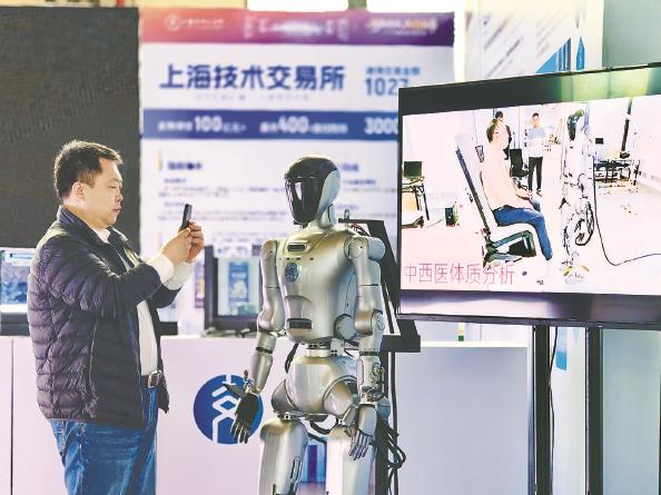 图为上海技术交易所展台上,复旦大学光华人形智能机器人展示养老照护等应用场景 本报记者 刘歆 摄影报道