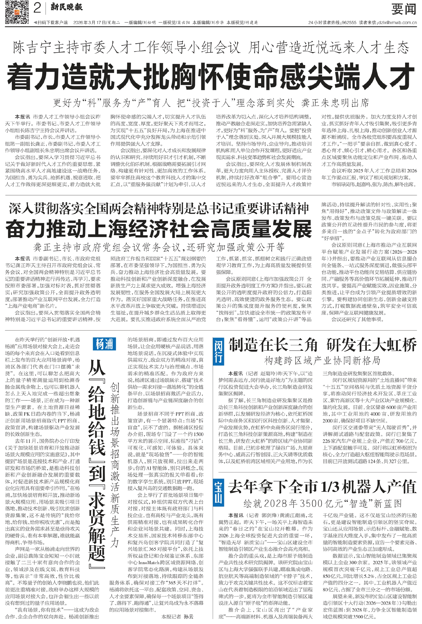 会议指出,要深入学习贯彻习近平总书记关于做好新时代人才工作的重要思想,紧紧围绕高水平人才高地建设这一战略任务,为国担当、勇为尖兵,抢抓机遇、锐意进取,把人才工作做得更深更细更实,着力造就大批胸怀使命感的尖端人才,切实提升人才队伍的高度、宽度、厚度,更好聚天下英才而用之,为实现“十五五”良好开局,为上海在推进中国式现代化中充分发挥龙头带动和示范引领作用提供强大人才支撑。
