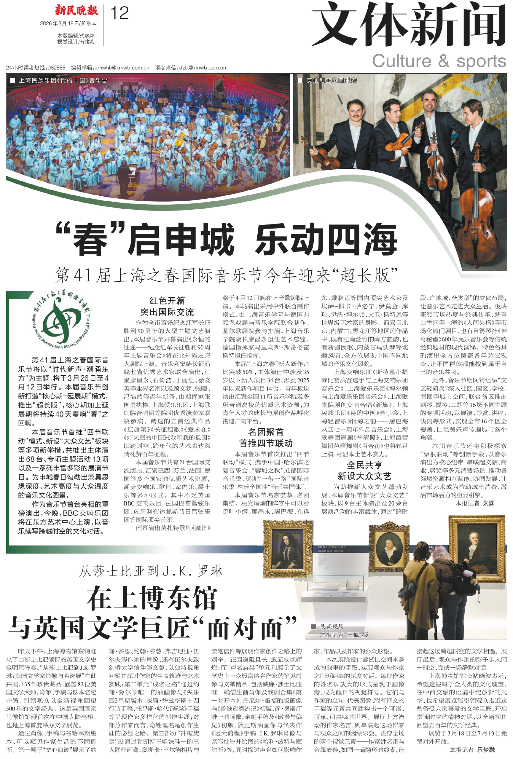 第41届上海之春国际音乐节将以“时代新声·潮涌东方”为主题,将于3月26日至4月12日举行。本届音乐节创新打造“核心期+延展期”模式,推出“超长版”,核心期加上延展期将持续40天奏响“春”之回响。