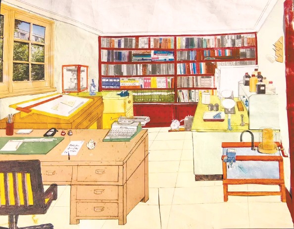 大姐夫给我解释过这幅画:“每一位来过我家的老朋友都可能记得二楼亭子间是我父亲的实验室,但遗憾没留下一张照片。我不是画家,没能力画,只能用工程画的方法加上刀刻剪贴拼拼凑凑,想想试试,修修改改,前前后后花了近一年时间才完成。每件物品和位置都是如初的,所以制作的过程也是一个回忆思念的过程,每动一笔一画都会引起当时情景的涌现,浮想联翩。”