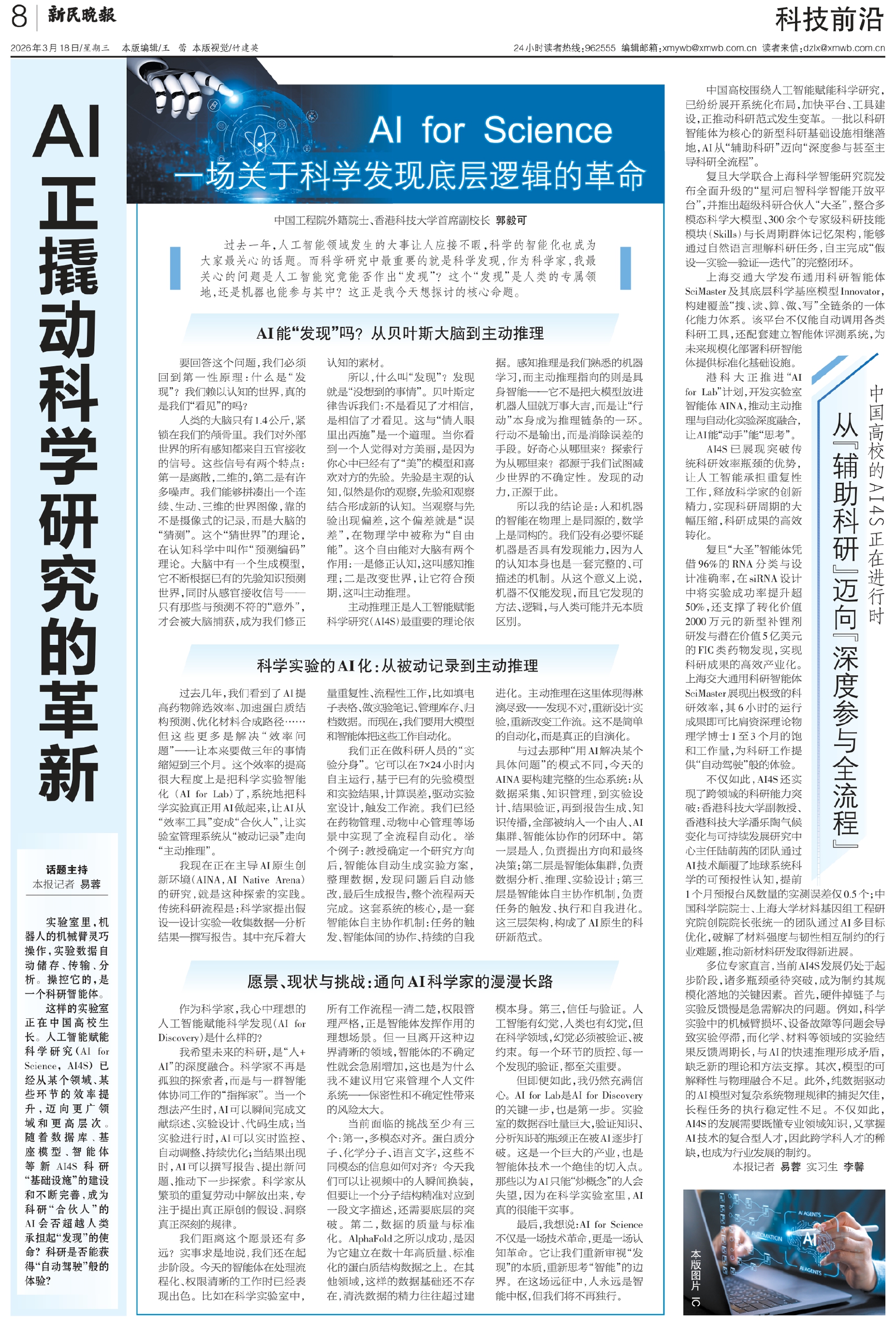 这样的实验室正在中国高校生长。人工智能赋能科学研究(AI for Science,AI4S)已经从某个领域、某些环节的效率提升,迈向更广领域和更高层次。随着数据库、基座模型、智能体等新AI4S科研“基础设施”的建设和不断完善,成为科研“合伙人”的AI会否超越人类承担起“发现”的使命?科研是否能获得“自动驾驶”般的体验?