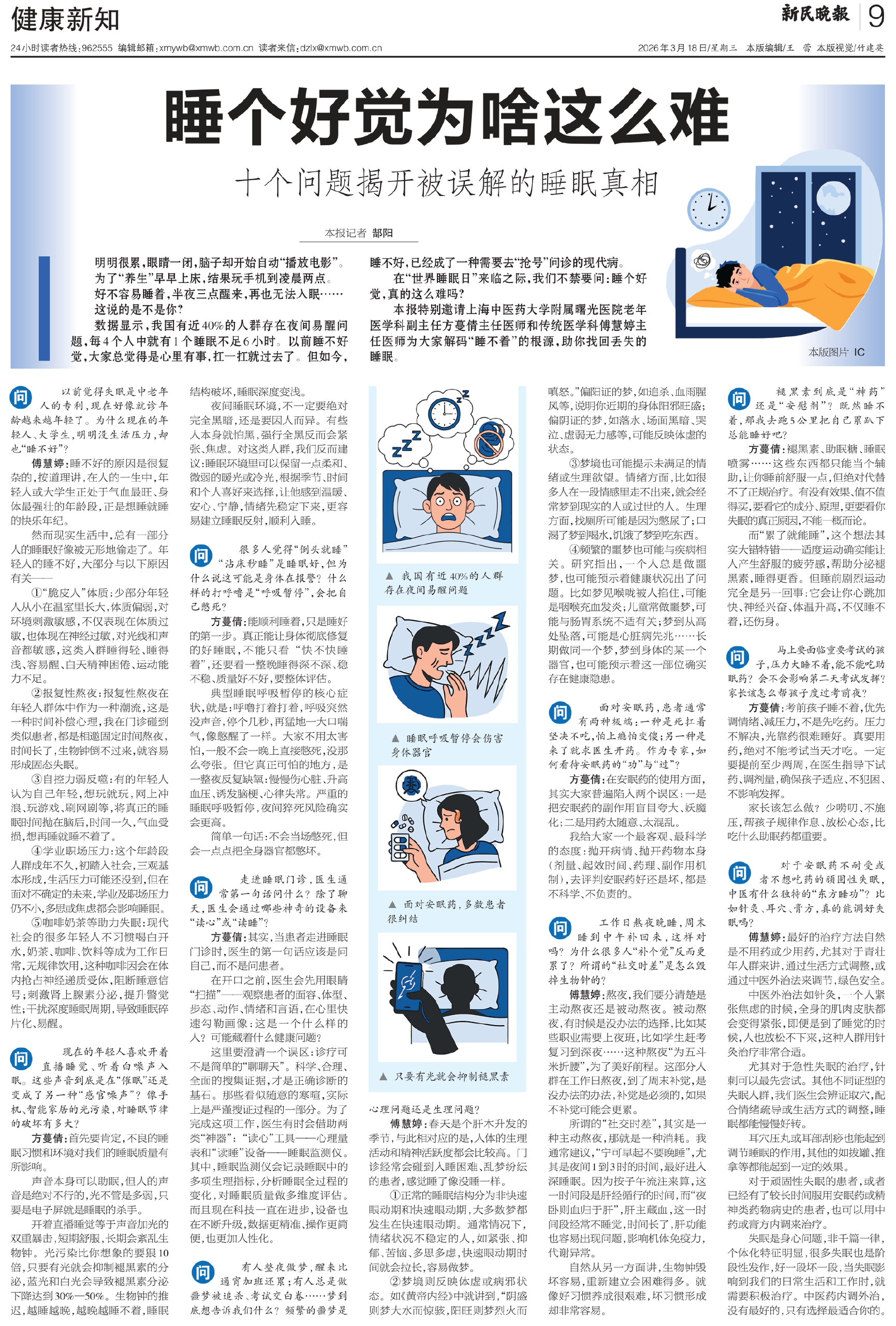 本报特别邀请上海中医药大学附属曙光医院老年医学科副主任方蔓倩主任医师和传统医学科傅慧婷主任医师为大家解码“睡不着”的根源,助你找回丢失的睡眠。