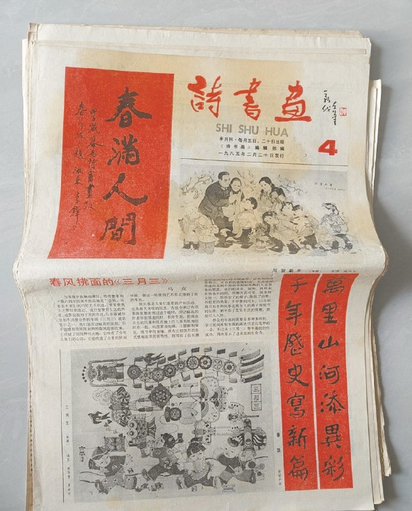 四开四版的小报,篇幅有限,正像四只小碟,如何配出各种花色的菜肴,是对厨师们的考验。由黄苗子等任主编、曹辛之任执行主编的《诗书画》的编者,是颇具匠心的。例如创刊号,四只碟子,各种菜点色香味俱全。诗有新体、旧体;画有国画、版画、壁画、漆画、油画、肖像画;书法图版则有五帧之多。此外,还有篆刻、题图、尾花等等,丰富多彩,引人入胜。