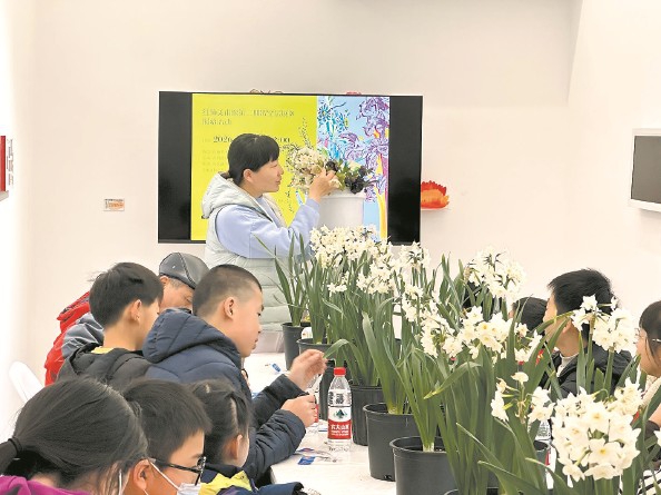 听完讲解,小区内的十几位“少年林长”又投身到美术馆公共空间的崇明水仙盆栽植物手工坊中。此时正值崇明水仙的花期,室内盛开的真花与室外岩彩绘制的艺术水仙相映成趣。孩子们在植物专家金梦怡等人的指导下,感受着插花哲学,甚至自发组织起社区环境清洁活动,将艺术的触角延伸至对社区生态的保护。