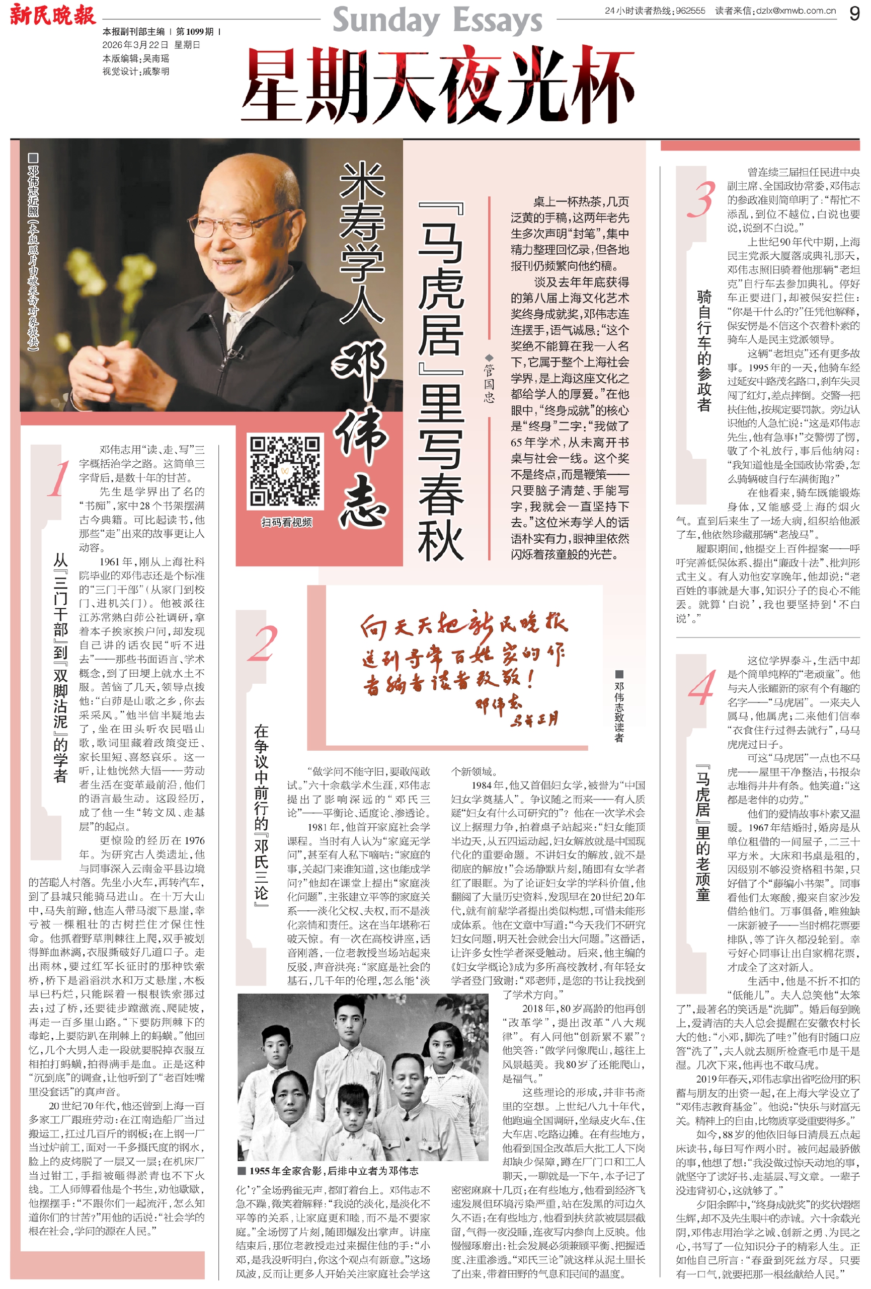 夕阳余晖中,“终身成就奖”的奖状熠熠生辉,却不及先生眼中的赤诚。六十余载光阴,邓伟志用治学之诚、创新之勇、为民之心,书写了一位知识分子的精彩人生。正如他自己所言:“春蚕到死丝方尽。只要有一口气,就要把那一根丝献给人民。”