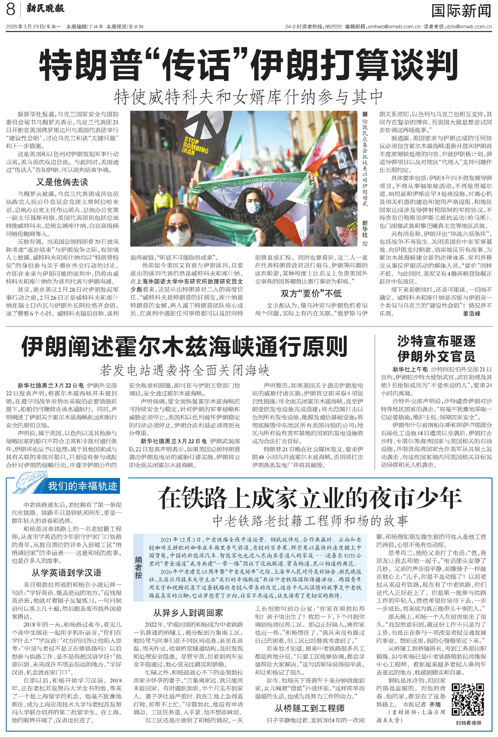 无独有偶。当美国总统特朗普20日放风称考虑“逐步结束”与伊朗战争之际,有知情人士披露,威特科夫和库什纳均以“特朗普特使”的身份参与关于潜在外交行动的讨论。亦即在未来与伊朗可能的谈判中,仍将由威特科夫和库什纳作为谈判代表与伊朗沟通。