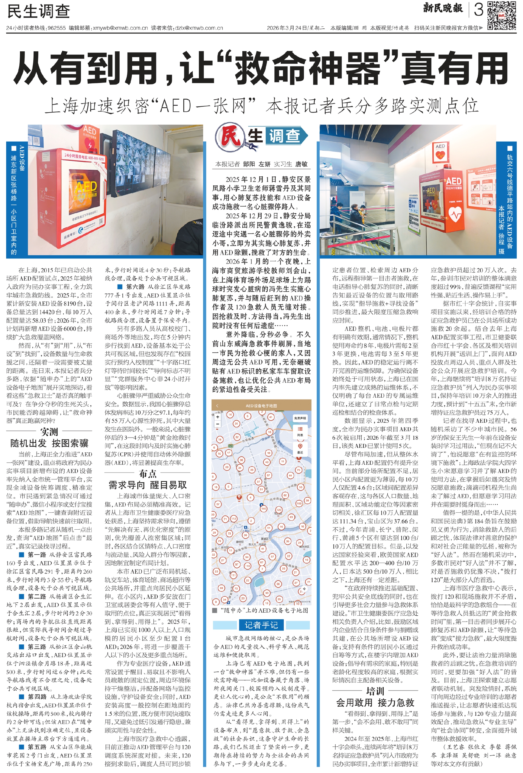 上海已有AED电子地图,找到一台“救命神器”并不难,但仍有一些坎需跨越——比如设备藏于角落、场所夜间关门、校园预约入校制度等。更让人忧心的,是公众“不敢用”的顾虑。法律已然为善意撑腰,这份底气仍需走进更多人心间。