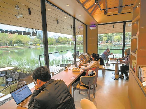 被誉为虹开发“城市绿洲”的新虹桥中心花园最近增添了一家湖畔书店,自然意趣与人文温度融为一体,吸引了不少市民游客前来阅读体验。 湖畔书店的图书选品精准贴合周边人群需求,既有滋养心灵的文学、生活类作品,也有适配白领的商业管理类读物,并增设了不少儿童绘本、儿童文学等书籍。此外,书店还引入了咖啡、茶饮和简餐。在这里,点一杯热饮,看春日草木生长,听时光静静流淌,可以尽享都市慢生活。 杨建正 摄影报道