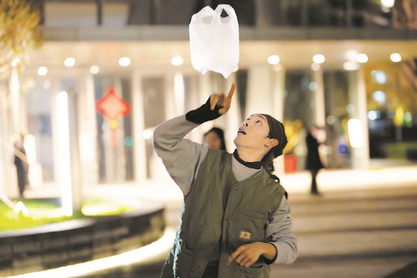 演出的序幕,在剧场外的喷水池边悄然拉开。B线演出的舞者背着行囊现身,随手将一只塑料袋抛向空中(见上图),轻巧的薄膜在微风中舒展、飘荡,他循着光影的轨迹踏出随性的舞步,天真烂漫的姿态瞬间吸引了在场观众,大家不自觉地放慢脚步,跟随着他的身影开启这场艺术之旅。