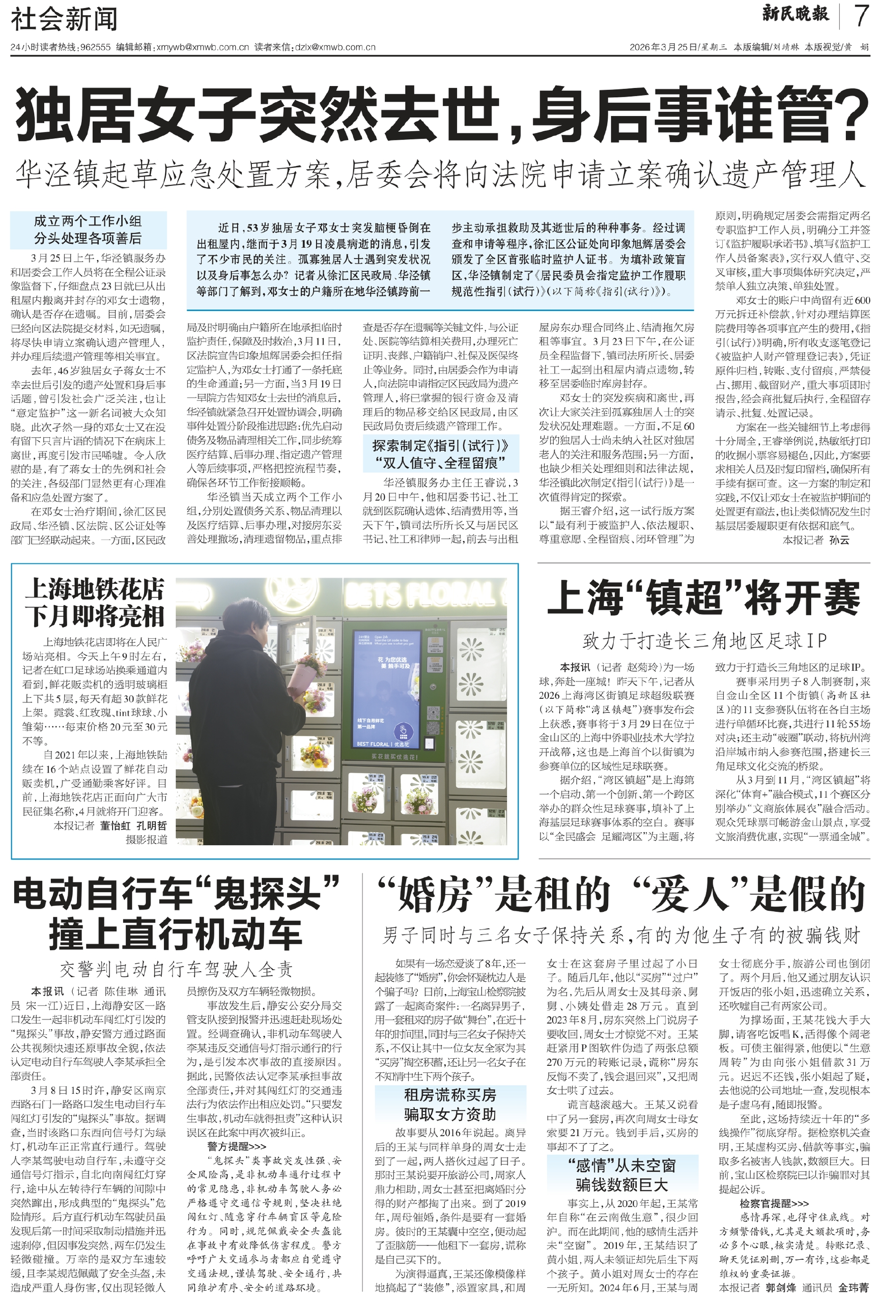 近日,53岁独居女子邓女士突发脑梗昏倒在出租屋内,继而于3月19日凌晨病逝的消息,引发了不少市民的关注。孤寡独居人士遇到突发状况以及身后事怎么办?记者从徐汇区民政局、华泾镇等部门了解到,邓女士的户籍所在地华泾镇跨前一步主动承担救助及其逝世后的种种事务。经过调查和申请等程序,徐汇区公证处向印象旭辉居委会颁发了全区首张临时监护人证书。为填补政策盲区,华泾镇制定了《居民委员会指定监护工作履职规范性指引(试行)》(以下简称《指引(试行)》)。