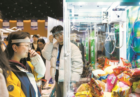 参观者现场体验脑波控制抓娃娃机 本报记者 陈梦泽 摄