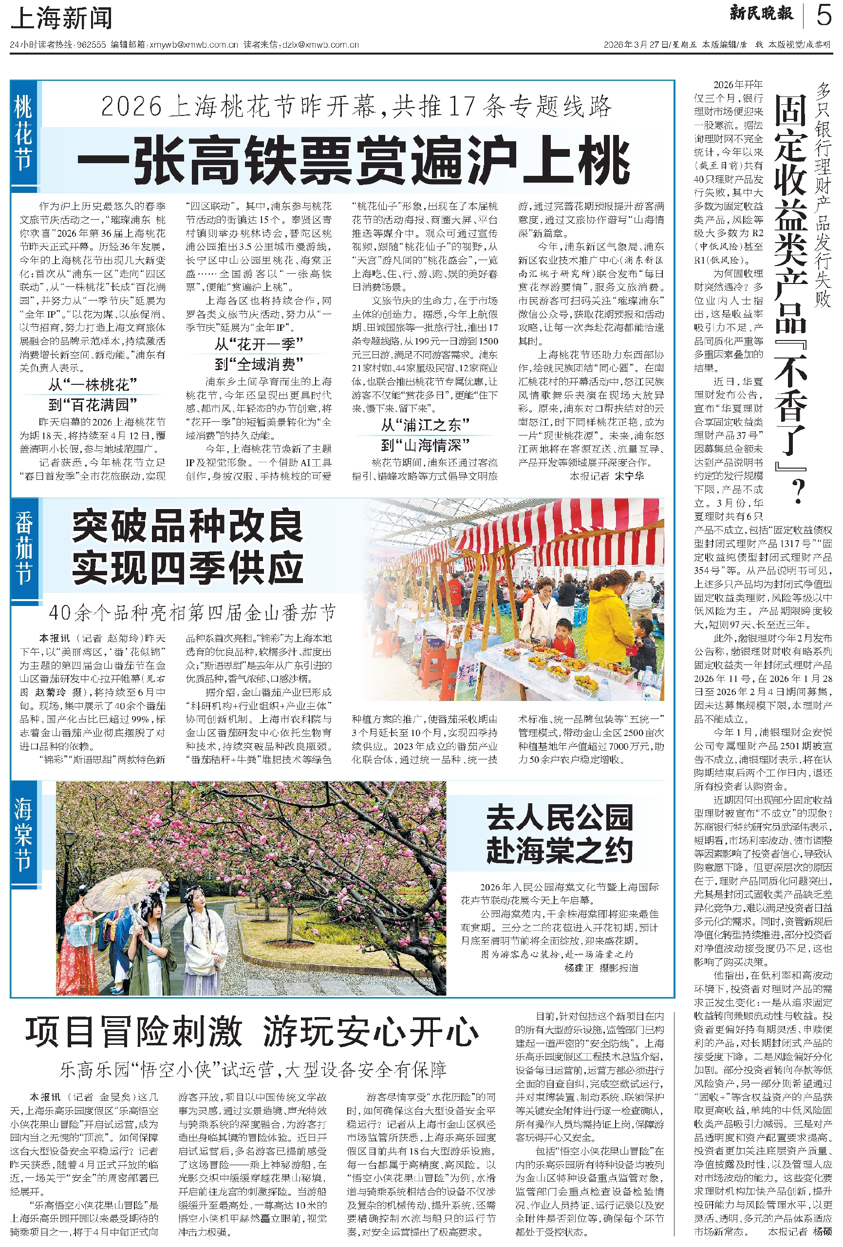 海棠节 去人民公园赴海棠之约 项目冒险刺激  游玩安心开心 固定收益类产品“不香了”? 番茄节 突破品种改良 实现四季供应 桃花节 一张高铁票赏遍沪上桃