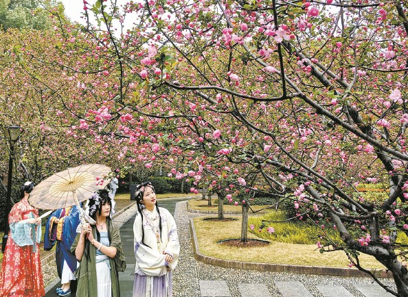 图为游客悉心装扮,赴一场海棠之约