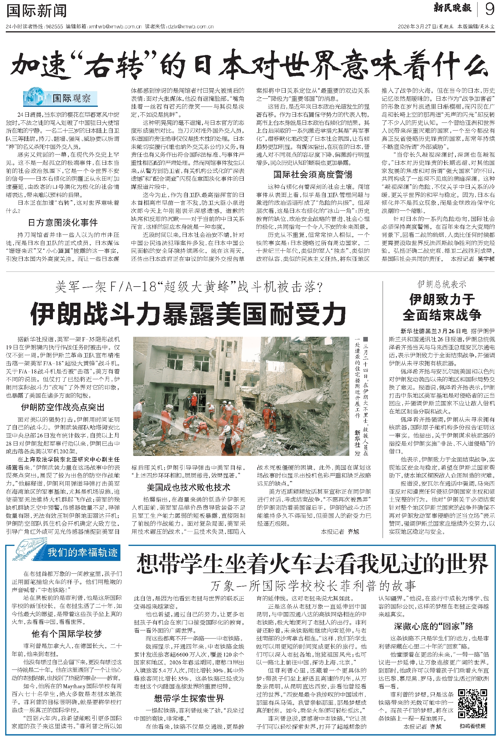 针对日本的一系列危险动向,国际社会必须保持高度警惕。在百年未有之大变局的背景下,回看二战的硝烟,人类比任何时候都更需要汲取世界反法西斯战争胜利的历史经验。弘扬正确二战史观、捍卫二战胜利成果,是国际社会共同的责任。 本报记者 吴宇桢