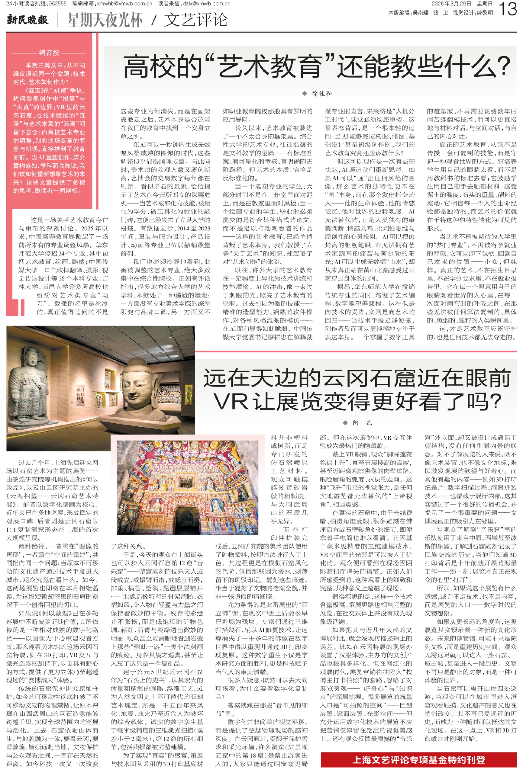 《逐玉》的“AI感”争议,拷问影视创作中“拟真”与“失真”的边界;VR里的云冈石窟,在技术赋能的“沉浸”与艺术本真的“疏离”间留下悬念;而高校艺术专业的调整,则将这场变革的寒意与机遇,直接推到了教育面前。当AI重塑创作、媒介重构感知、学科面临洗牌,我们该如何重新想象艺术的未来?这些文章提供了多棱的思考,邀读者一同辨析。